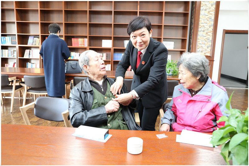 党组成员、政治部主任王郑燕为93岁离休老干部黄政芝带上法徽
