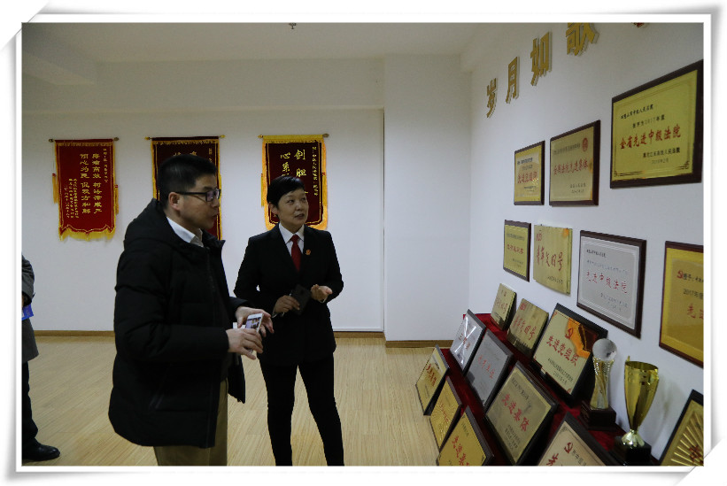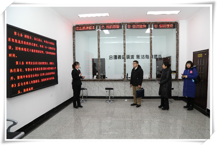 督查组参观了诉讼服务中心、科技法庭、图书馆和荣誉室,督察组成员坐在法椅,最近距离的感受到了法治的庄严和公正;在综合服务区,督察组详细了解了立案流程和多元化解机制;在图书馆,观看了“公众开放日”宣传片,参观了全市法院系统“我心中的天平”文化作品展。