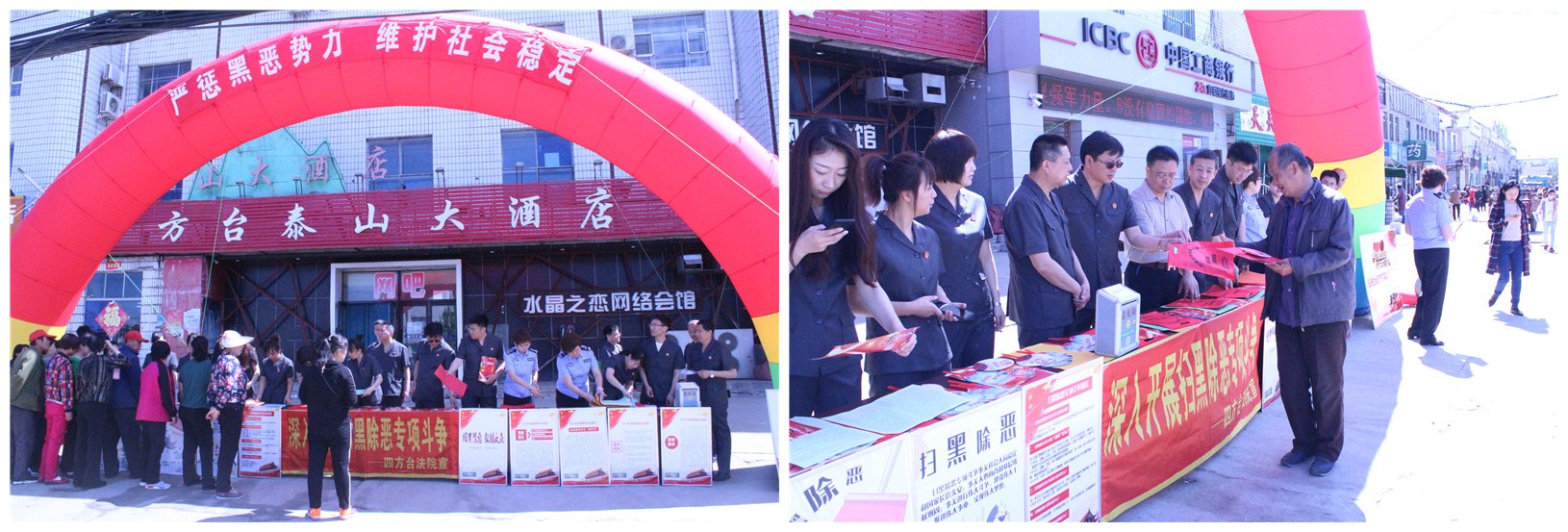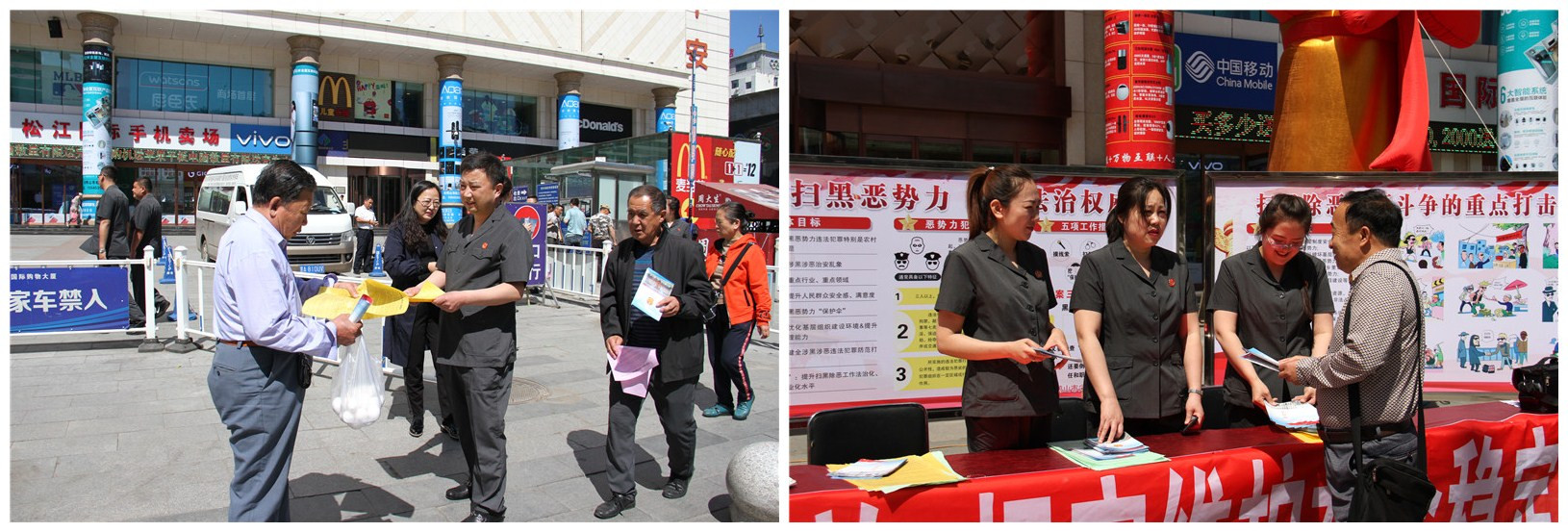 两级法院在各自辖区人口密集区域设立集中宣传点,摆建咨询台、安置法律法规讲解员、受理举报线索、挂设条幅标语、发放扫黑除恶专项斗争明白卡、传单、增设宣传展板、播放宣传片、曝光涉黑涉恶典型案例等形式向广大人民群众提供法律咨询,普及扫黑除恶相关法律知识,公布举报电话,向人民群众全面宣传专项斗争工作,全面展示专项斗争成果。