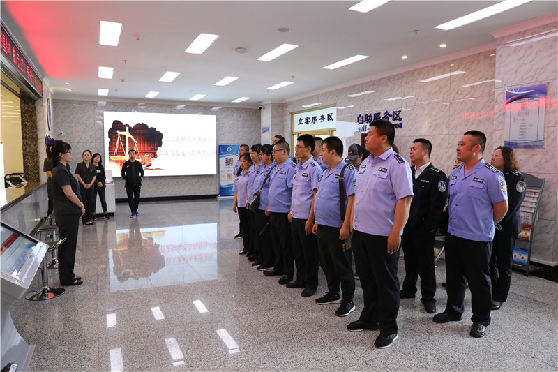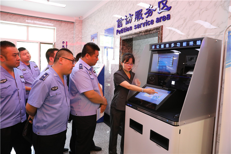 在诉讼服务中心,环卫工人们在讲解员的解说与引导下,了解诉讼服务中心的功能设施,体验多功能诉讼、诉讼风险评估、智能诉状三个自助终端。