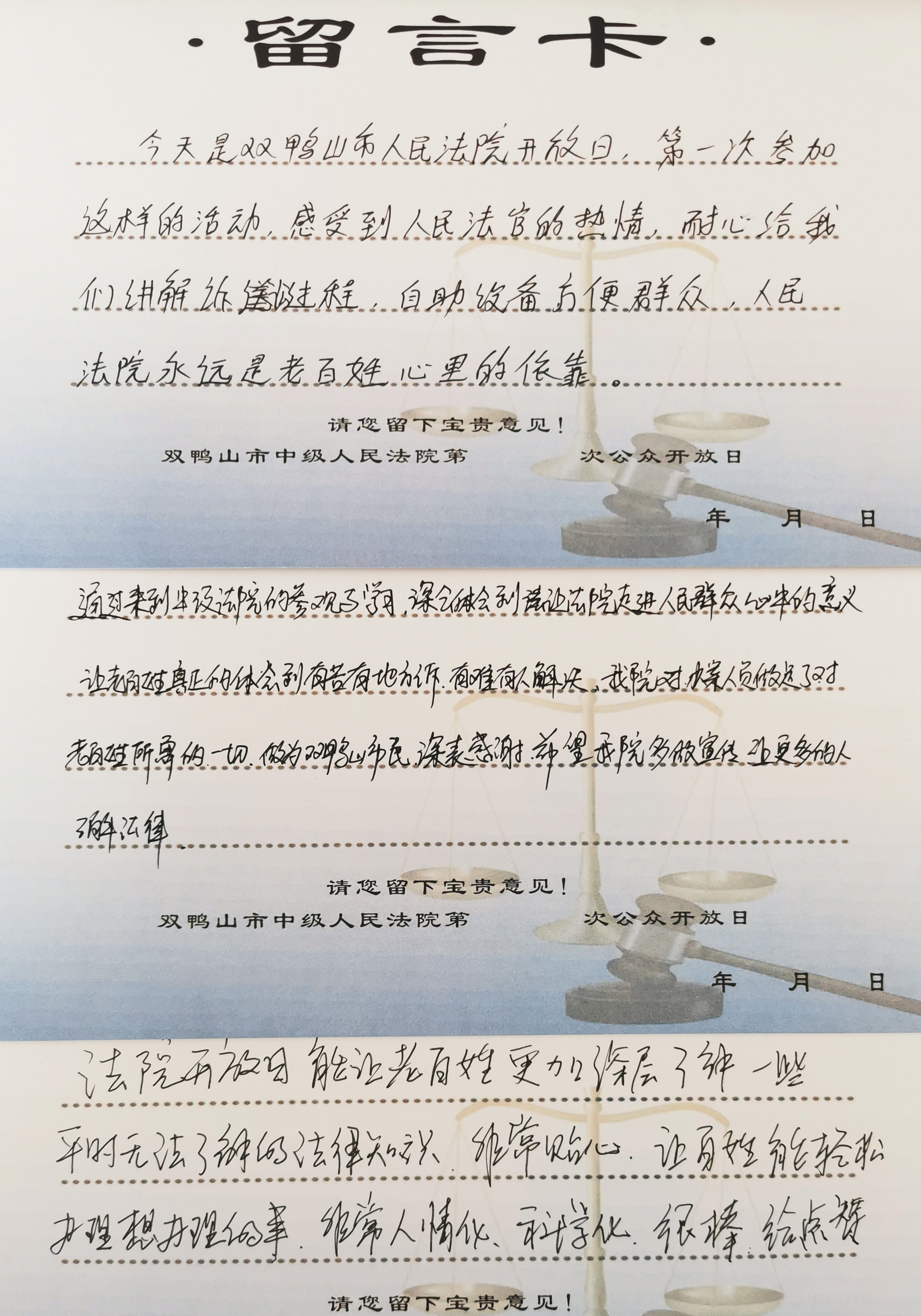 参加人员纷纷表示,通过开放日活动和座谈交流感受到了人民法院践行司法为民、公正司法、文明司法,推进“打官司不求人”工作做出的努力,展现了法院“青年文明号”的良好风貌,将在今后的生活和工作中树牢法治信仰,愿与人民法院一道,努力为美丽双鸭山建设做出新的更大贡献!