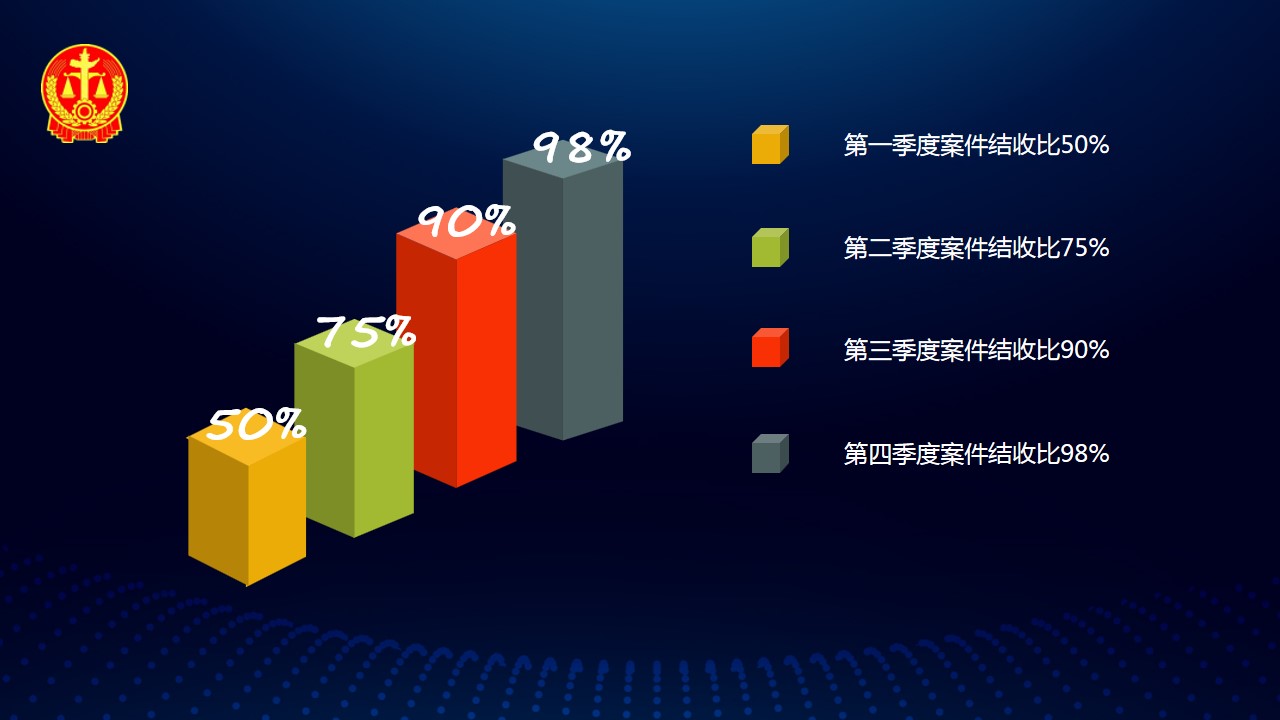一是增强预见性,科学设定均衡结案指标。双鸭山中院党组对近年来收结案、质效指标等进行多方调研,指出“人案矛盾”是影响双鸭山法院审判质效提升的重要因素,对两级法院提出了均衡结案的要求。通过对收结案情况多维度分析,结合审判执行工作推进、多元化纠纷解决机制功能发挥、受理案件范围调整及案件增长态势等考量因素,对2017、2018、2019年度收案情况进行预测,制定年度结案计划,制发《双鸭山市中级人民法院关于完善审判运行机制建设的意见》,科学设定分段式综合结案率指标,明确第一季度案件结收比50%,第二季度案件结收比75%,第三季度案件结收比90%,第四季度案件结收比98%,并将完成情况纳入年终绩效考核内容,强力推进均衡结案管理。