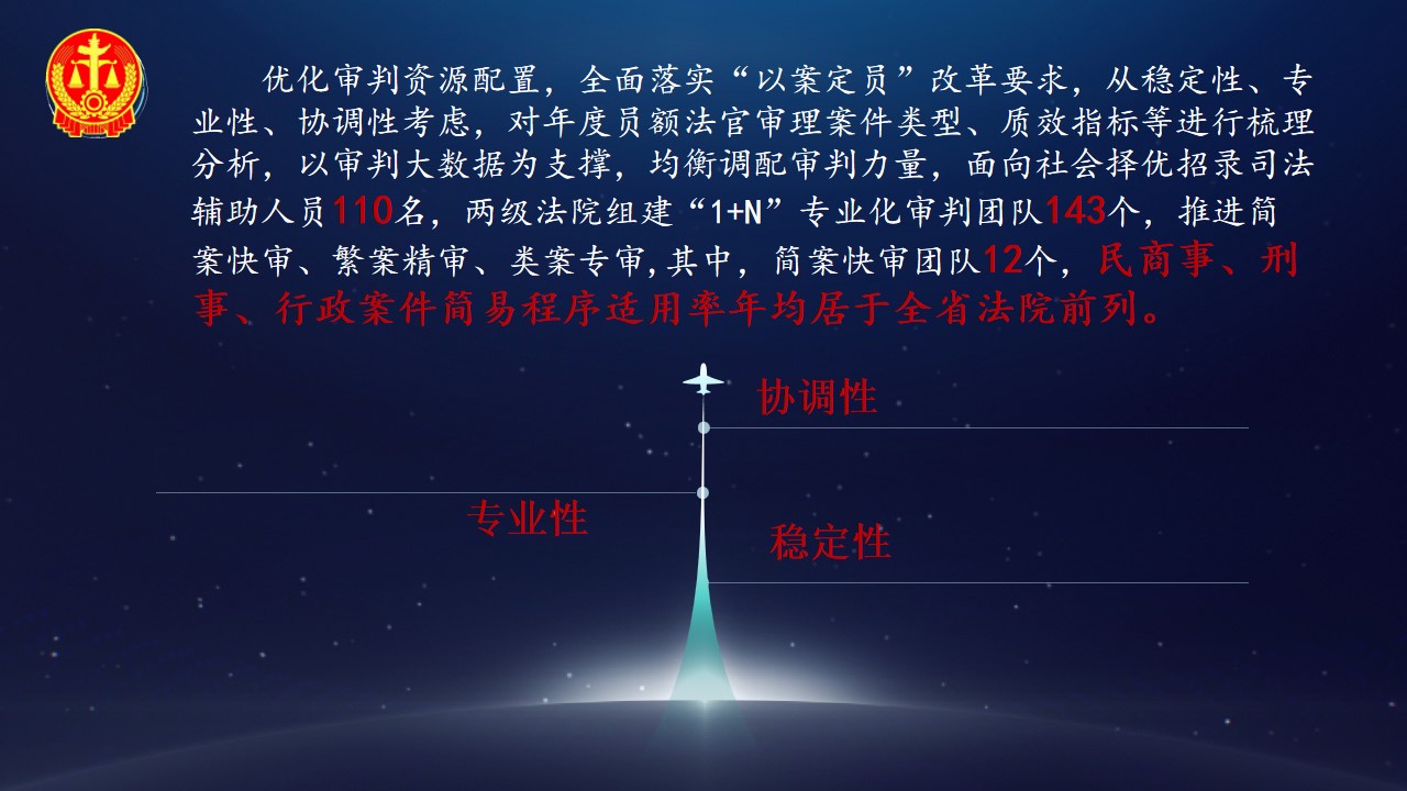 二是注重前瞻性,加强均衡结案制度建设。加强分案机制建设,遵循审判团队审理类型、分案数量、轮流分案三项原则,实行随机分案、按类分案、专业分案与二次分案相结合的分案制度,为提高办案效率、推进均衡结案打下坚实基础。优化审判资源配置,全面落实“以案定员”改革要求,从稳定性、专业性、协调性考虑,对年度员额法官审理案件类型、质效指标等进行梳理分析,以审判大数据为支撑,均衡调配审判力量,面向社会择优招录司法辅助人员110名,两级法院组建“1+N”专业化审判团队143个,推进简案快审、繁案精审、类案专审,其中,简案快审团队12个,民商事、刑事、行政案件简易程序适用率年均居于全省法院前列;以中院3名年轻法官组成的审判团队充分发挥干劲足、热情高、肯吃苦、能力强的骨干作用,自2018年9月组建以来月均结案58.7件,且无被发改和超审限情况发生;发挥院庭长传帮带作用,完善《双鸭山市中级人民法院院庭长办案工作规则》,提高院庭长办案比例,每月通报院庭长办案情况,带动全体法官办案积极性。两年来,院庭长办理各类案件24096件,占结案总数的53.4%,其中,办理信访及重大疑难复杂案件120件,进一步推进均衡结案工作扎实开展。