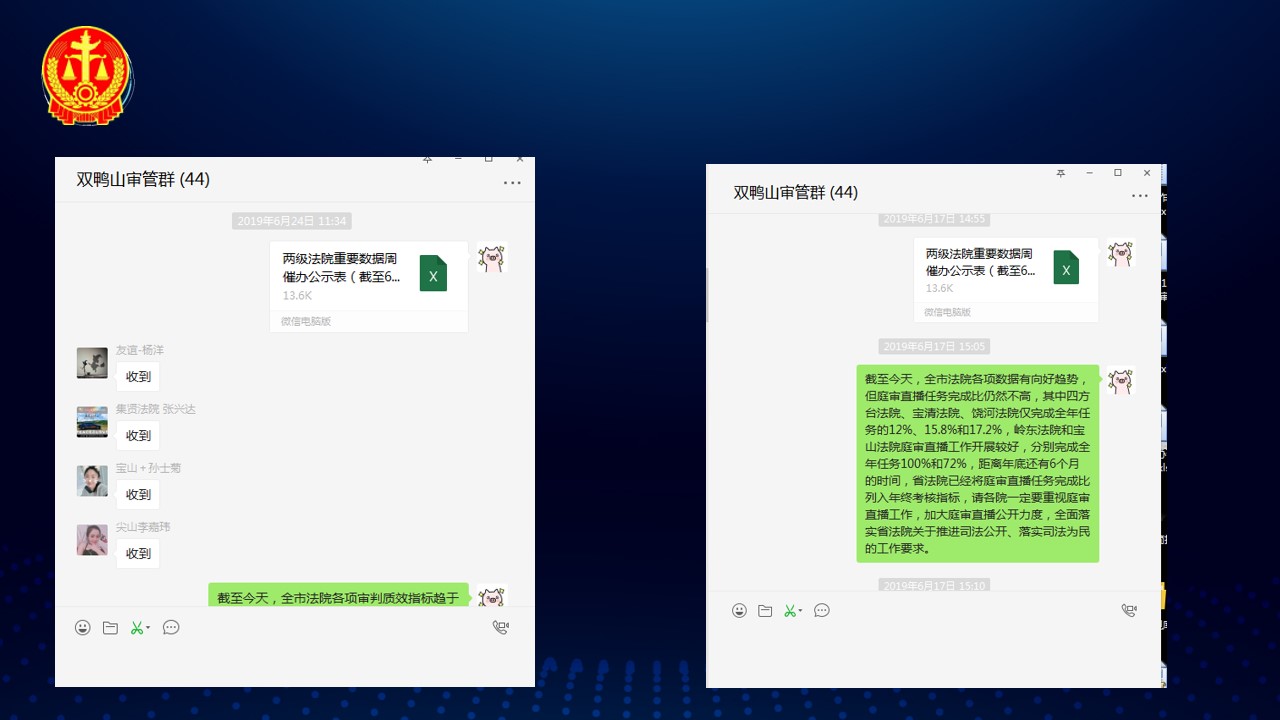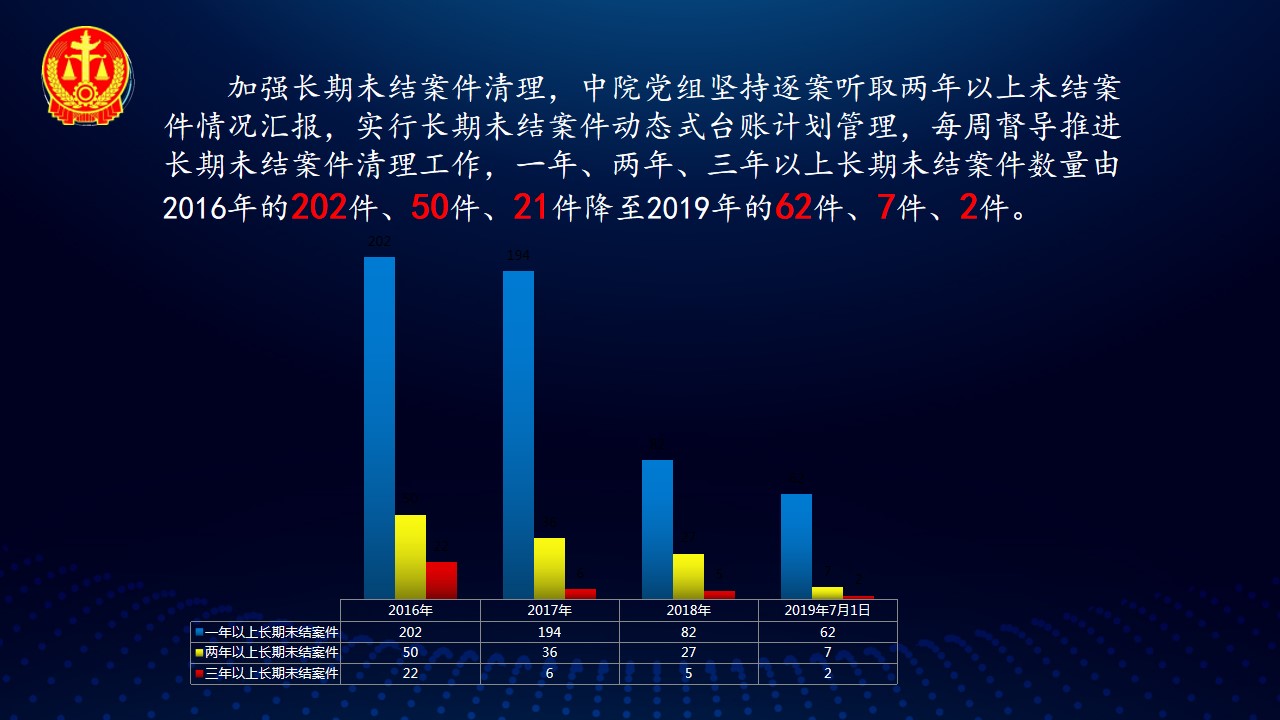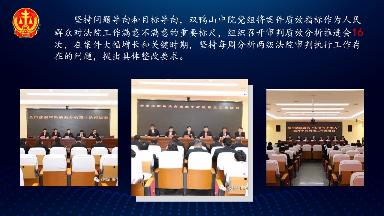 三是发挥主动性,督导均衡结案落实落地。两级法院党组、院庭长、审判管理部门、全体员额法官坚持各司其职、各负其责,充分发挥主观能动性,均衡结案意识不断增强。加强数据分析研判,每周监测两级法院案件重要指标运行情况,对照省法院考核指标和先进法院审判质效数据,每周下发案件平均审理时间、超审限、扣除审限案件催办公示表、每月发布审判质效情况通报、每季发布审判运行态势分析,对每周未达到预计指标的基层法院,采取常态化电话、微信催办指导和深入审判庭室、基层法院等方式推进两级法院提高案件质量,缩短案件审理周期,促进季度结案节奏均衡。加强长期未结案件清理,中院党组坚持逐案听取两年以上未结案件情况汇报,实行长期未结案件动态式台账计划管理,每周督导推进长期未结案件清理工作,一年、两年、三年以上长期未结案件数量由2016年的202件、50件、21件降至2019年的62件、7件、2件。加强正向引领,7名优秀法官走上讲台交流分享办案心得,引领推动法官们积极主动作为,主动加班加点,推进案件质效指标持续向好;坚持问题导向和目标导向,双鸭山中院党组将案件质效指标作为人民群众对法院工作满意不满意的重要标尺,组织召开审判质效分析推进会16次,在案件大幅增长和关键时期,坚持每周分析两级法院审判执行工作存在的问题,提出具体整改要求。加强督导落实,建立中院党组成员及各对口业务庭室联系点法院工作制度,中院党组成员80余次深入基层法院,帮助解决各院在推进均衡结案和提高审判质效中存在的问题;坚持每月召开民商事案件上下交流研讨会,为32案件提出咨询指导意见,持续推进均衡结案部署在两级法院得到不折不扣贯彻落实。