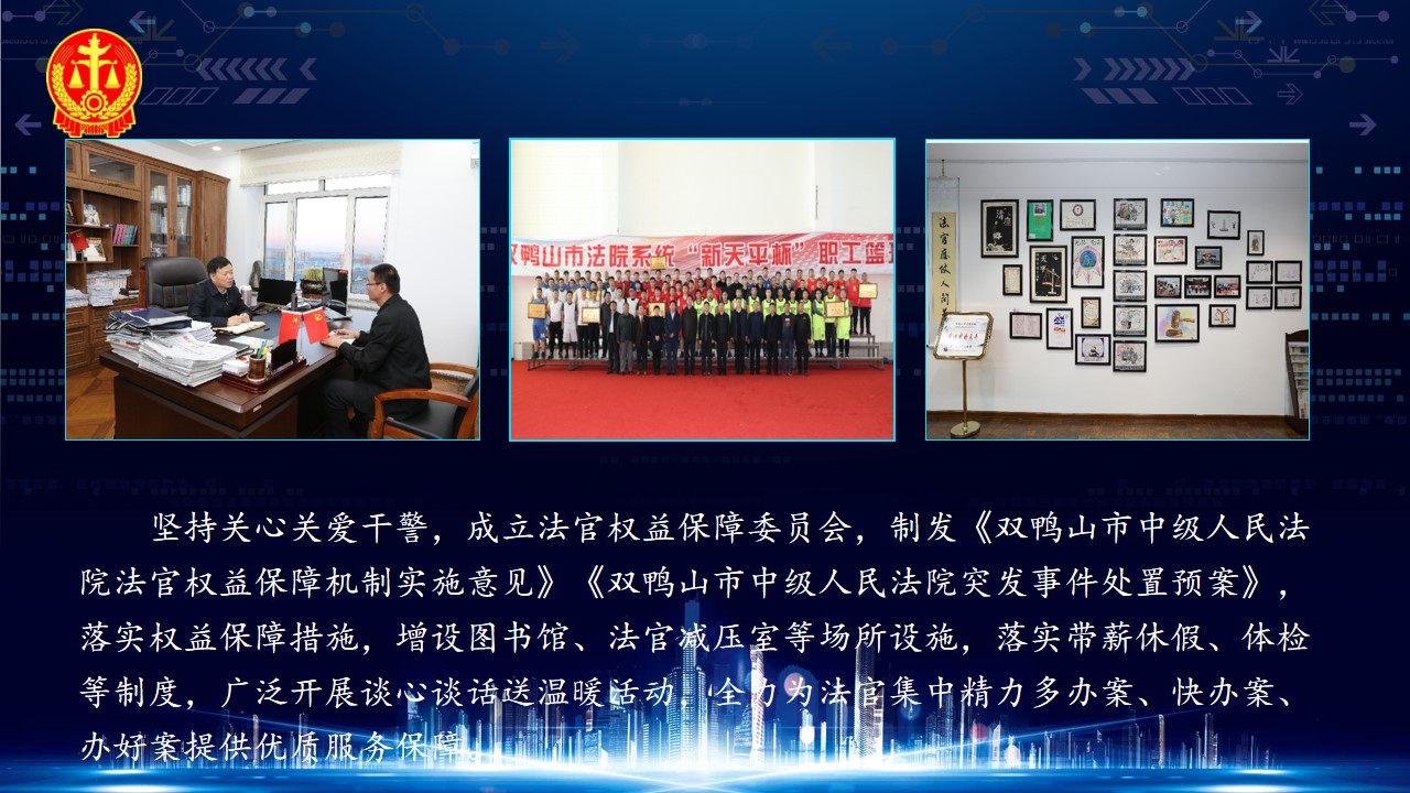 四是强化保障性,落实均衡结案配套措施。加强智慧法院建设,2017年以来,双鸭山中院将信息化建设与司法改革措施落实作为科学发展的“车之两轮、鸟之双翼”,投资970余万元,完成模块化机房、诉讼服务中心升级改造,增设语音转换生成笔录推送、文书纠错、电子卷宗随案同步生成及深度应用等智能辅助系统应用,减轻法官事务性工作负担,提供均衡结案科技支持。加强专业化建设,发挥专业法官会议咨询指导作用,共召开专业法官会议143次,为462件案件提供个案咨询指导,对标对表分析指标走向,制定类案审理指引、规范案件审理标准,加快办案节奏;依托“山城法苑”讲坛、举办业务培训、与高校结对深造等方式,集中组织各类学习培训29期,培训员额法官1150余人次,组织33名民商事法官赴西南政法大学等高校学习,从理论上、实务上助力法官素质提升。坚持关心关爱干警,成立法官权益保障委员会,制发《双鸭山市中级人民法院法官权益保障机制实施意见》《双鸭山市中级人民法院突发事件处置预案》,落实权益保障措施,增设图书馆、法官减压室等场所设施,落实带薪休假、体检等制度,广泛开展谈心谈话送温暖活动,全力为法官集中精力多办案、快办案、办好案提供优质服务保障。