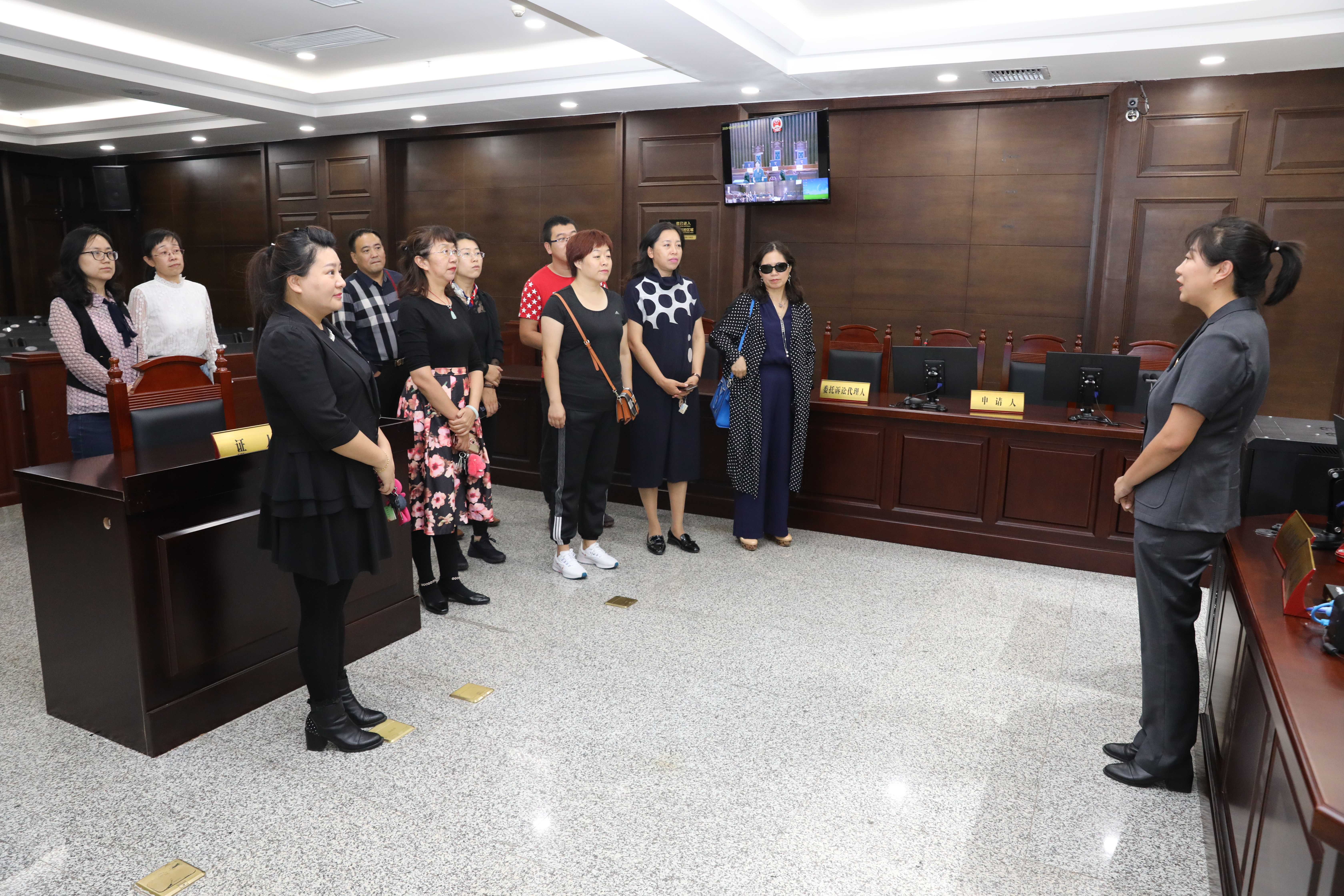 在讲解员的引导下,对诉讼服务中心、科技法庭、执行指挥中心和图书馆进行了参观,教师们了解了有关智慧法院建设、审判流程等相关工作情况,走上审判席,体验了法椅、法槌等法律元素,感受法官的庄严与神圣,法庭的威严与肃穆,对法院各项工作有了更加直观全面的认知。