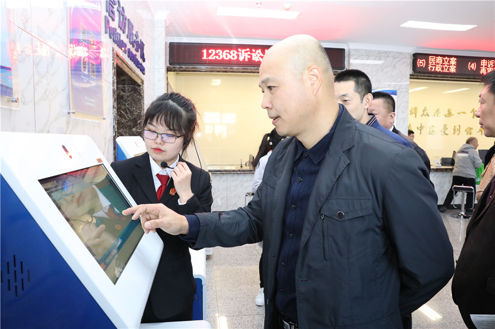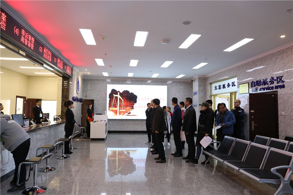 在讲解员的带领下,司法局工作人员参观了诉讼服务中心、科技法庭、执行指挥中心和图书馆等区域,在诉讼服务中心聆听了我院青年干警原创歌曲《逐光》,了解并亲身体验了诉讼风险评估机、诉状辅助生成一体机及诉讼服务多功能终端机器。在律师会见室、法律援助值班室、诉调对接室等地进行了参观,并对我院健全的律师化解机制、法律援助机制和完善的联动机制给予好评。