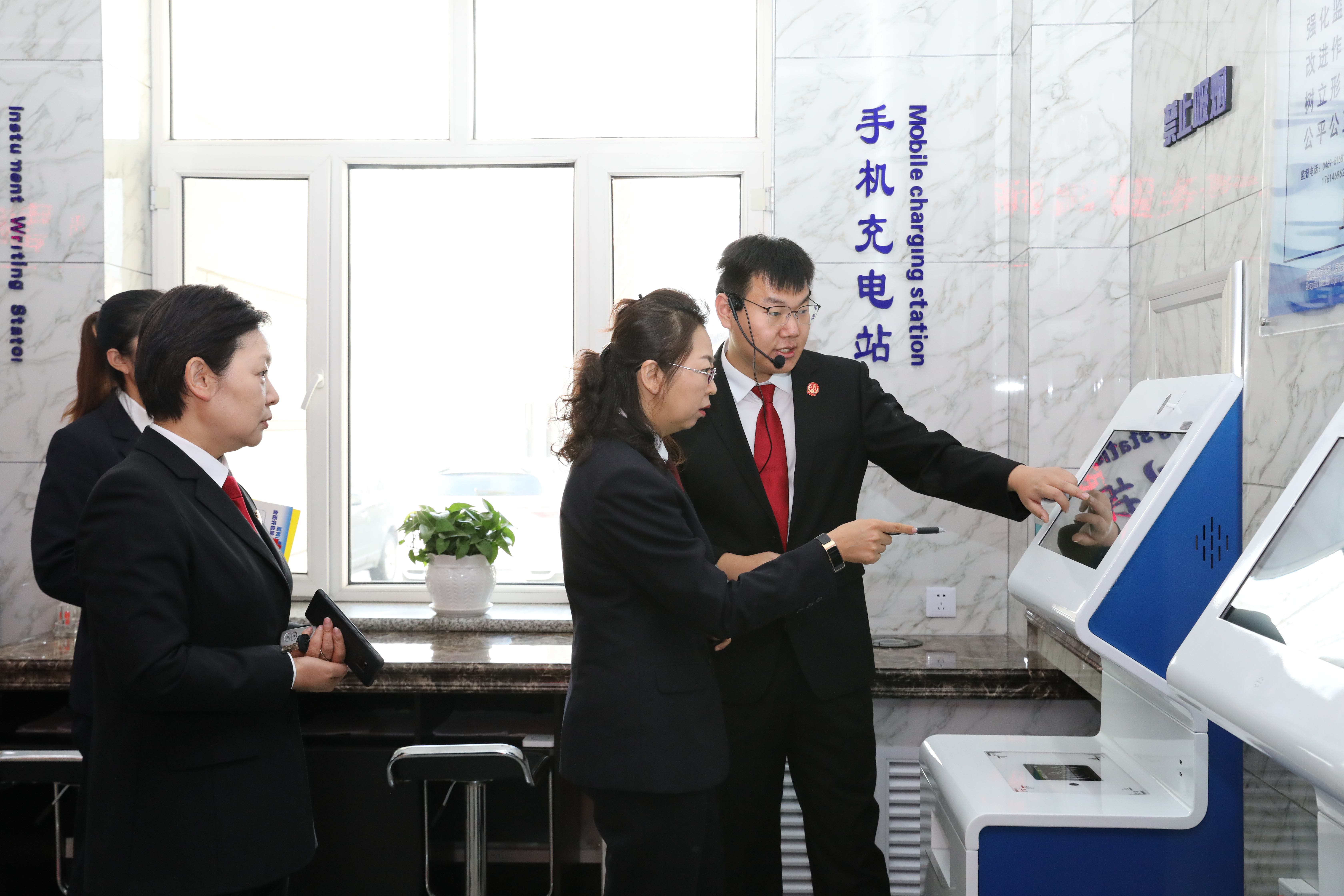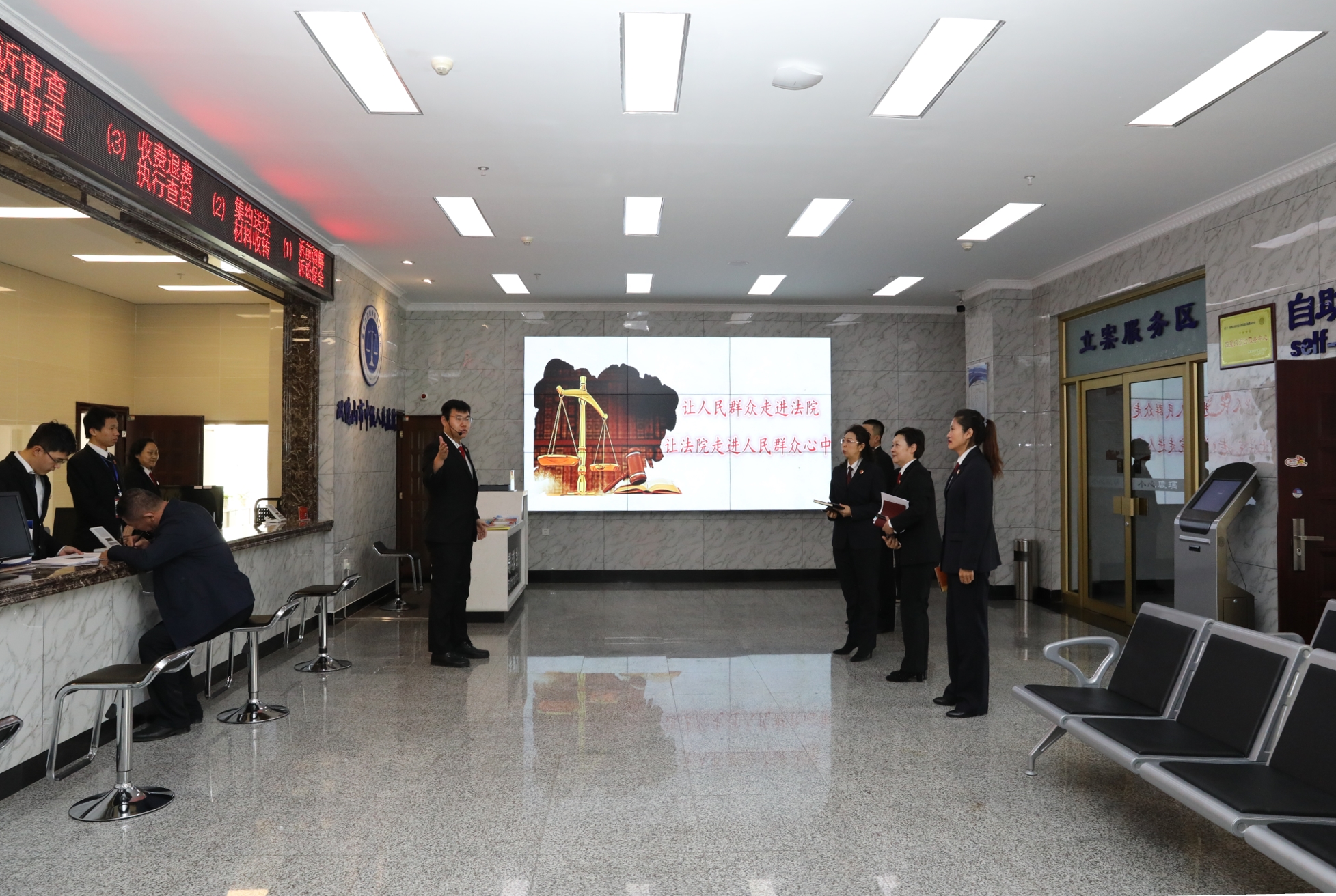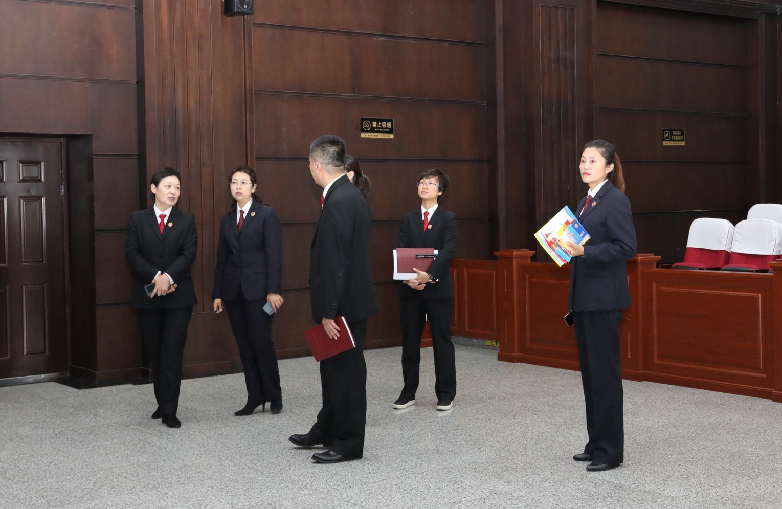 在工作人员的介绍下参观了诉讼服务中心、科技法庭和图书馆,了解并体验了智能服务终端机器、聆听了我院干警原创歌曲《逐光》,在图书馆参观了《我心中的天平》干警书画作品展并给予好评。