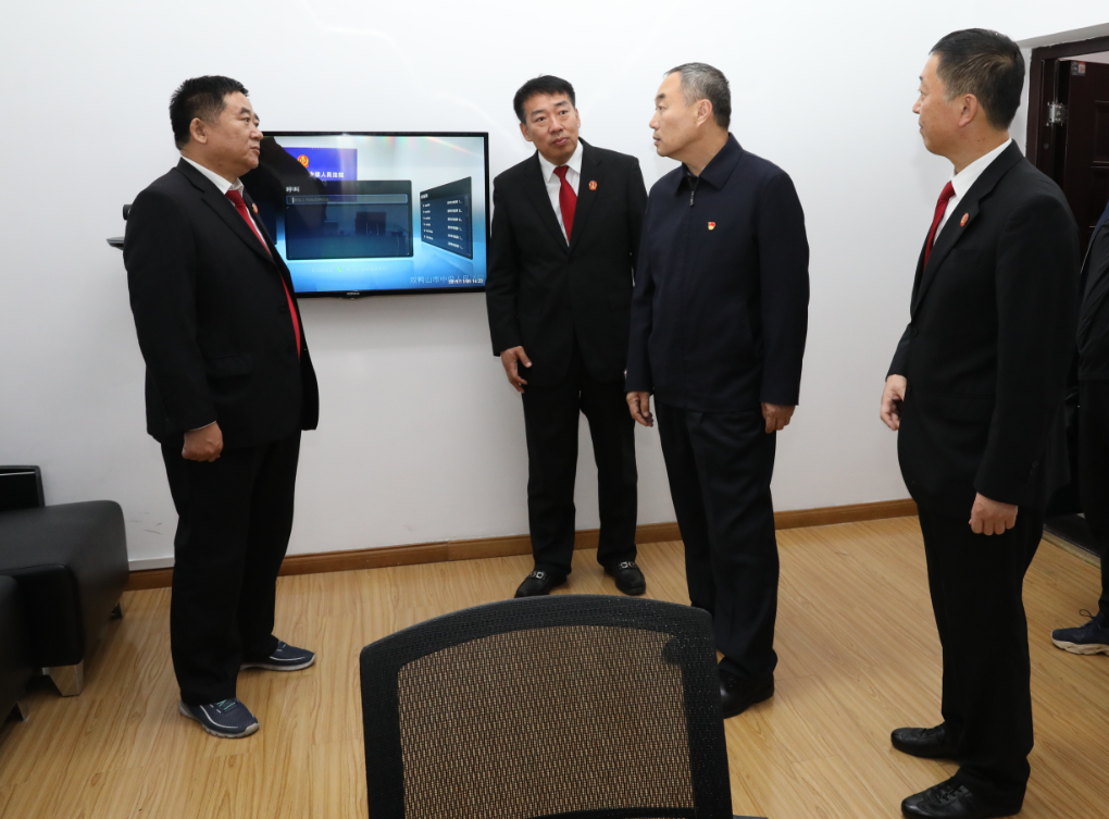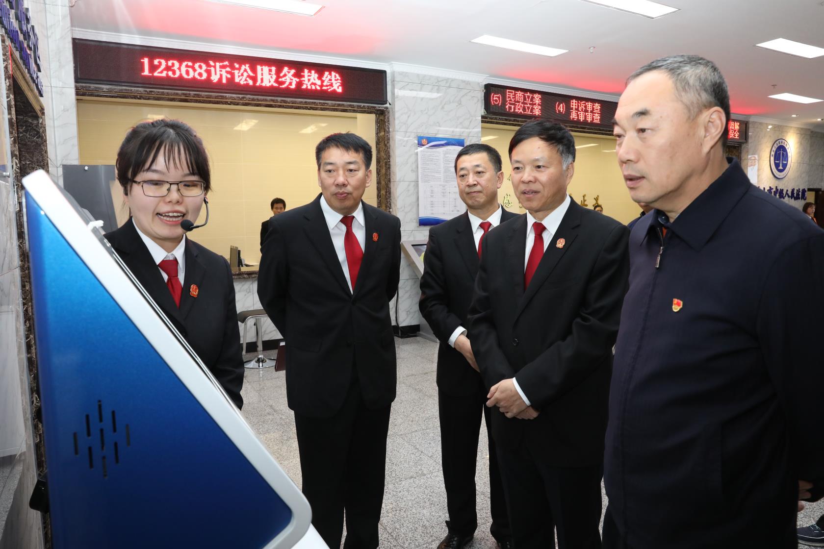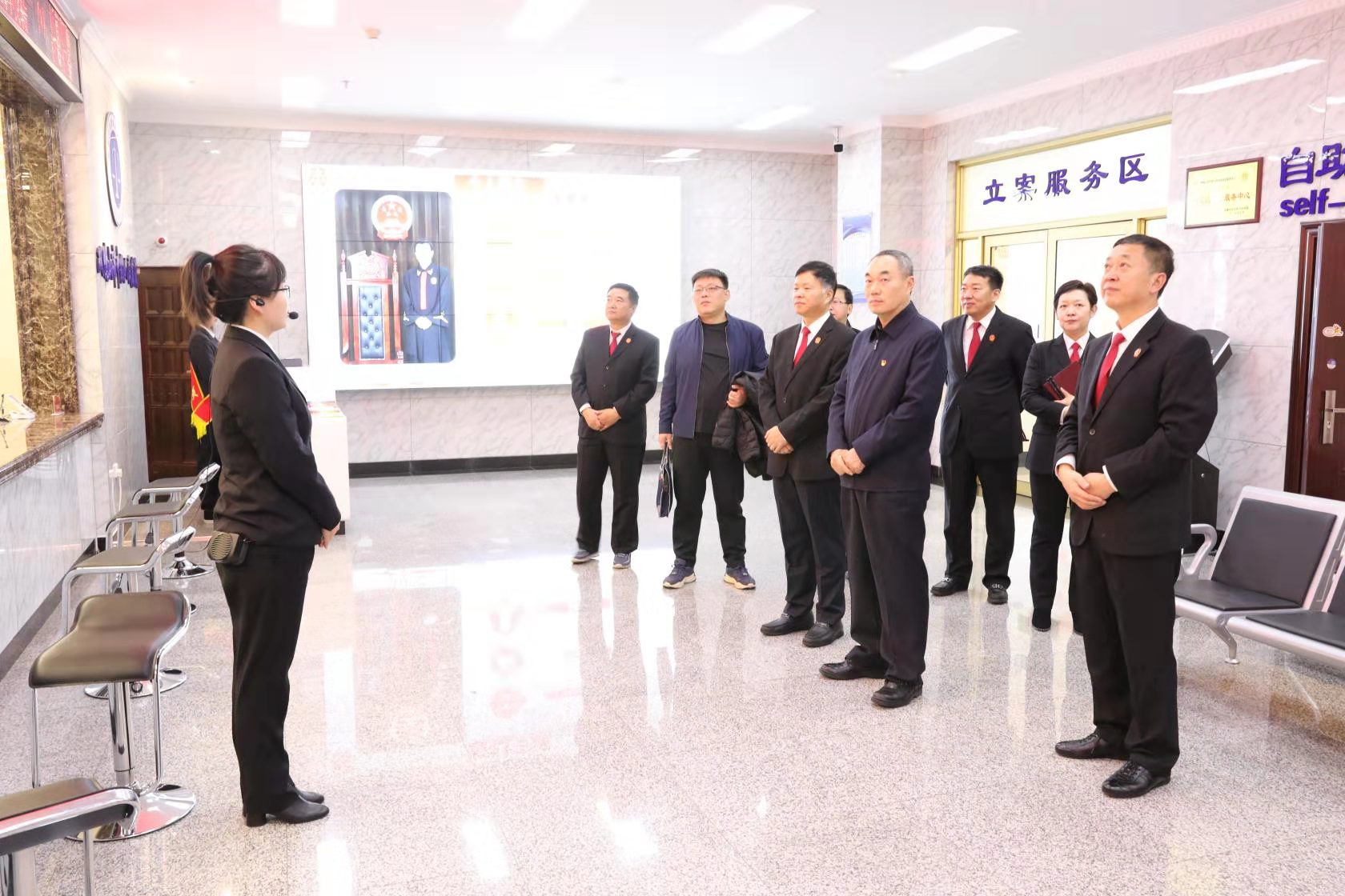 石兰波组长一行深入到诉讼服务中心,了解网上立案和跨域立案相关情况,体验诉讼智能服务终端;在图书馆参观 “我心中的天平”干警书画作品展。党组书记、院长田守明陪同参观。