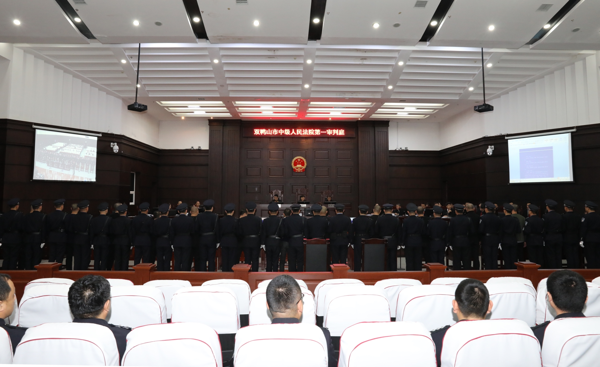 在市委的坚强领导下,双鸭山中院高度重视扫黑除恶专项斗争。2019年11月13日上午9时,双鸭山中院公开开庭审理全市第一起涉黑社会性质组织犯罪的高某某等19名被告人上诉一案。党组书记、院长田守明担任审判长,市检察院党组书记、检察长付军担任“第一”检察员出庭履行职务。法院院长亲自审理涉黑案件,体现了主动担当、勇挑重担的工作作风,彰显了法院依法履行审判职能,全力维护社会稳定的决心和力度,深入推进全市扫黑除恶专项斗争向纵深发展。