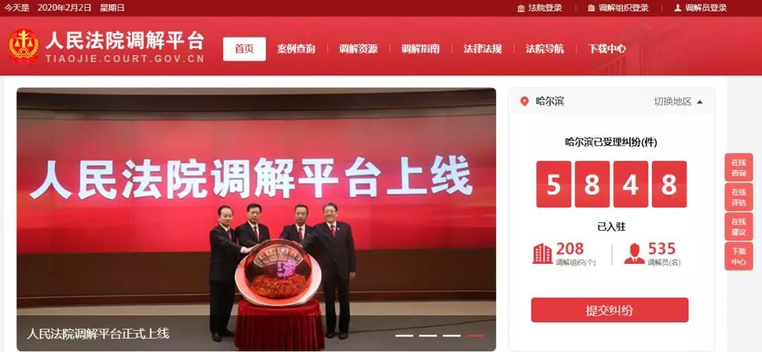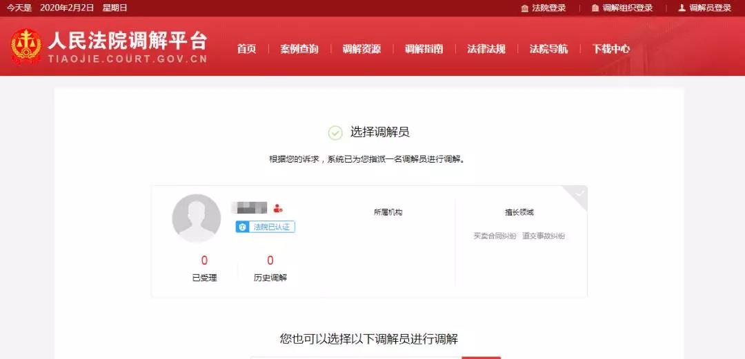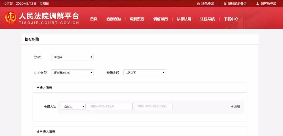 1.电脑中输入http://tiaojie.court.gov.cn/,进入全国统一调解平台。