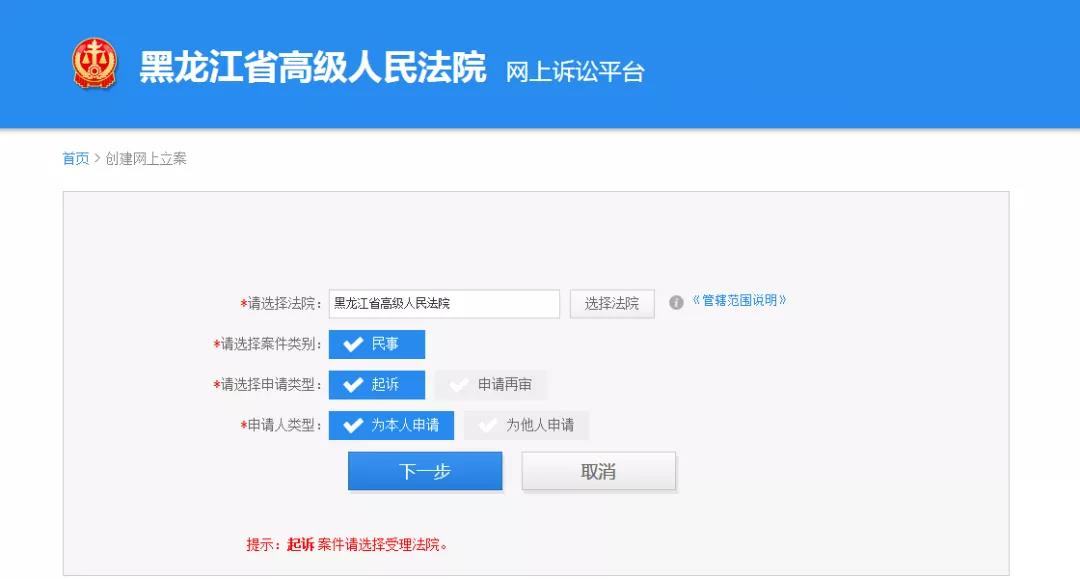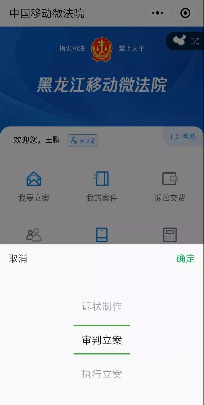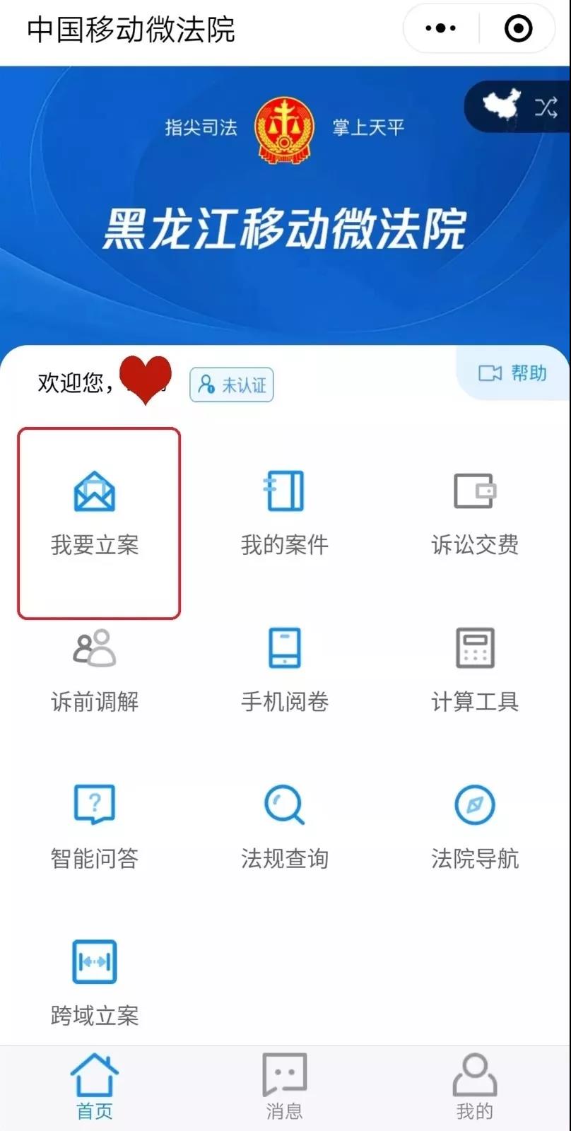 3.申请立案:注册成功后,进入“黑龙江省移动法院”操作界面,点击“我要立案”模块,选择“审判立案”或“执行立案”选项,点击“申请立案”按钮,在列表中选择受诉法院,随后按提示上传此前已经准备好的立案相关材料,材料齐全后提交申请。