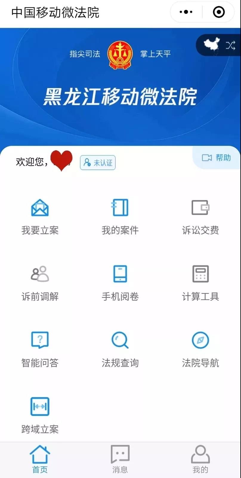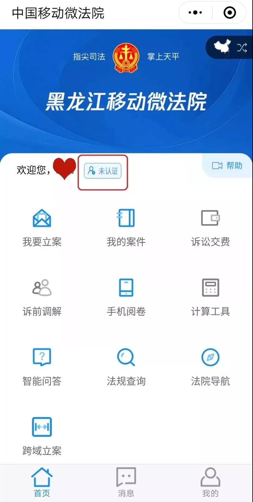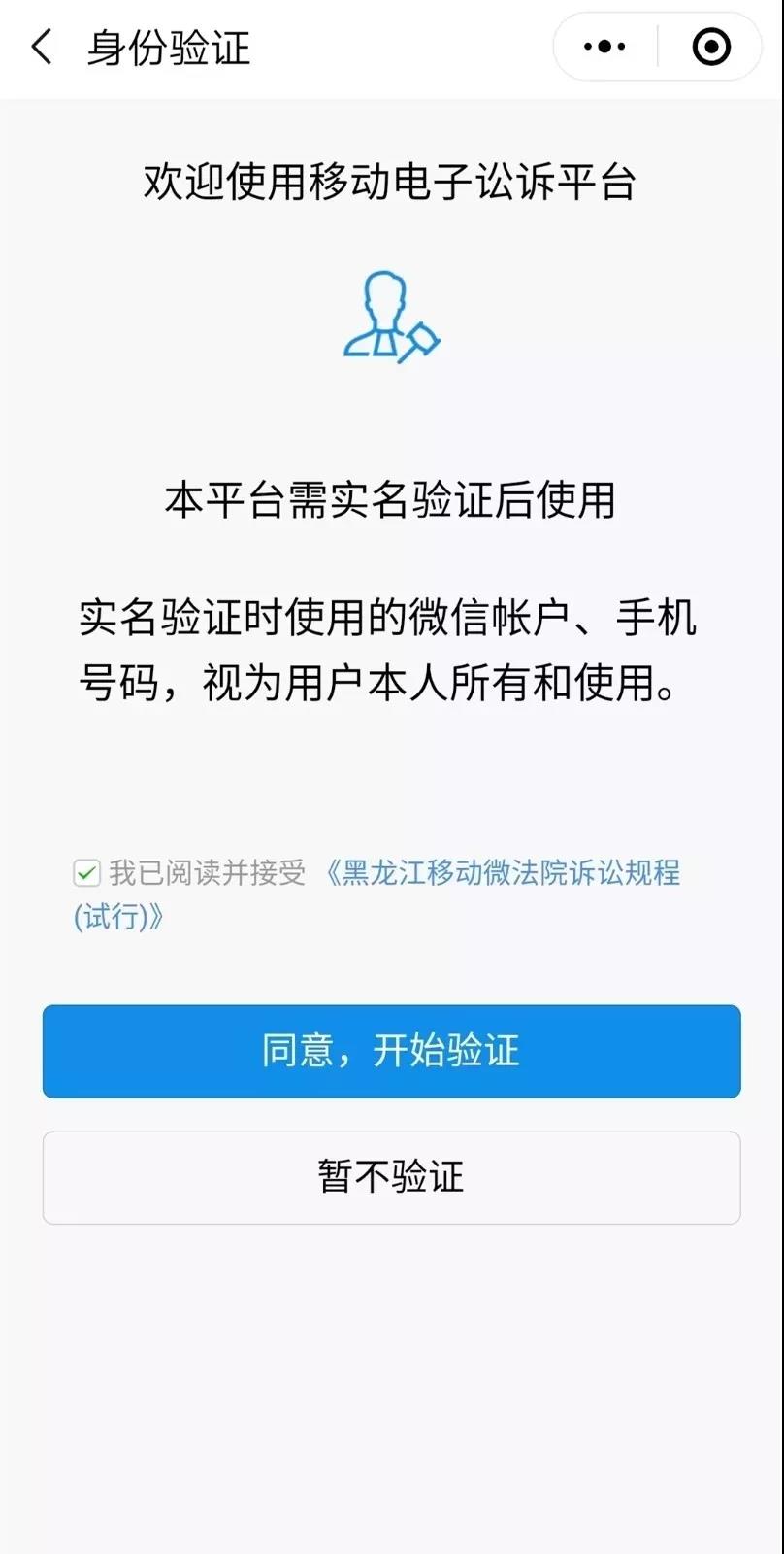 2.身份验证:进入“黑龙江移动微法院”小程序后,按照系统操作提示逐步输入姓名、身份证号、手机号码等信息,进行身份验证完成注册。