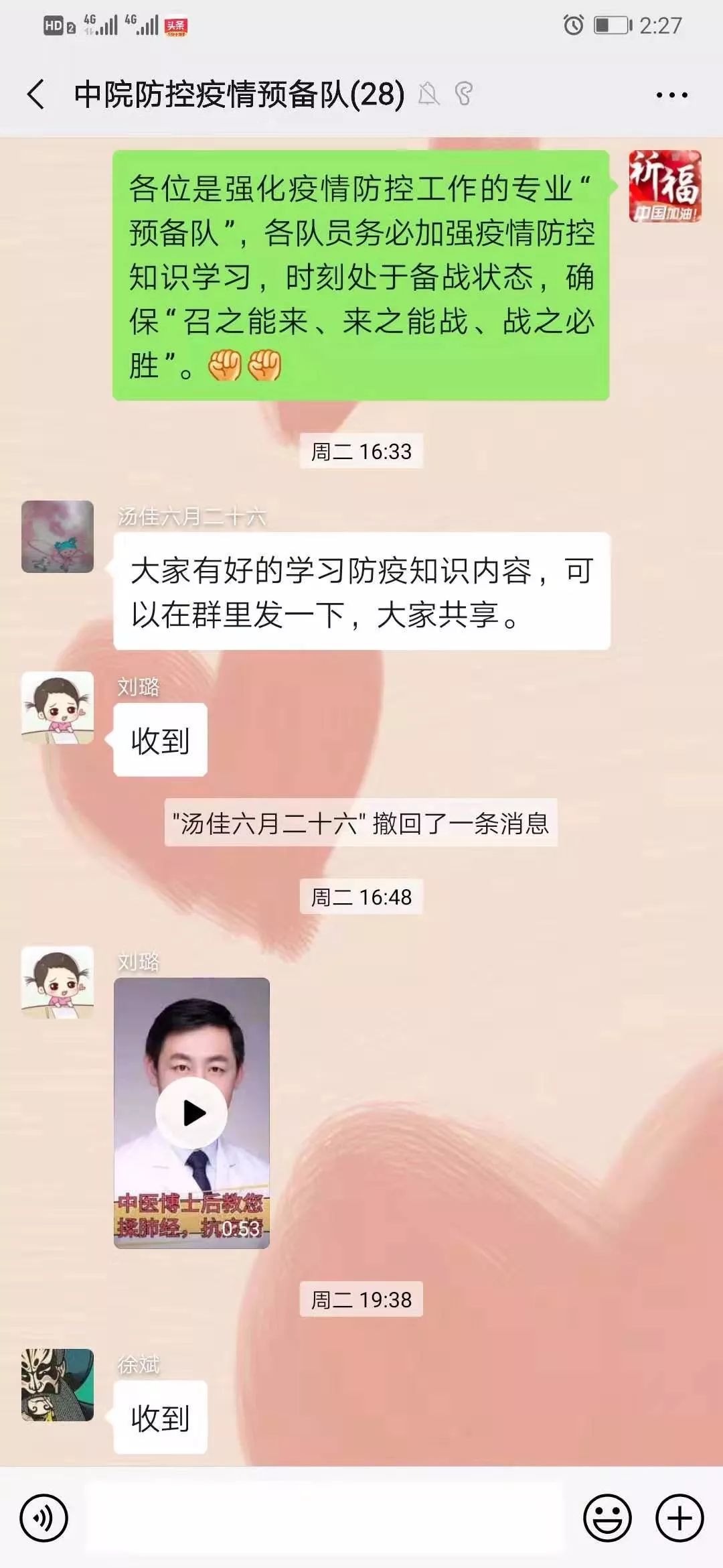 双鸭山中院35周岁以下干警自发组织成立防控疫情预备队,充分发挥青年干警先锋模范作用,担当作为,冲锋在前,全力做好一线信息排查员、宣传员、防守员工作。