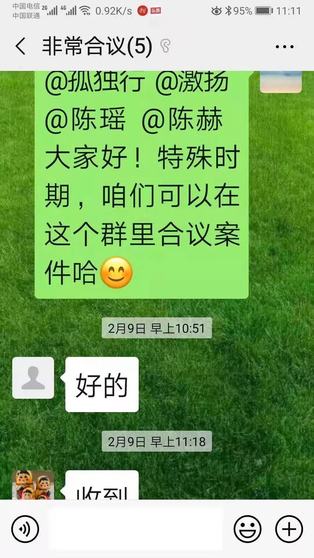 “现在是2月11日13时,各审监团队合议庭成员、书记员均已到位,下面请主审人汇报案件”随着审判长一条语音信息的发送,“非常合议群”开始了特殊的案件合议形式。他们利用微信视频通话形式,对一起再审审查案件进行评议,法官们“面对面”的充分发表自己的观点,书记员进行记录整理案件争议焦点及合议庭成员意见。合议庭通过在线合议,承办法官充分征求并听取了审判团队法官们的意见,并综合考虑涉案因素,对三件涉及民生的案件作出了初步的审理意见。