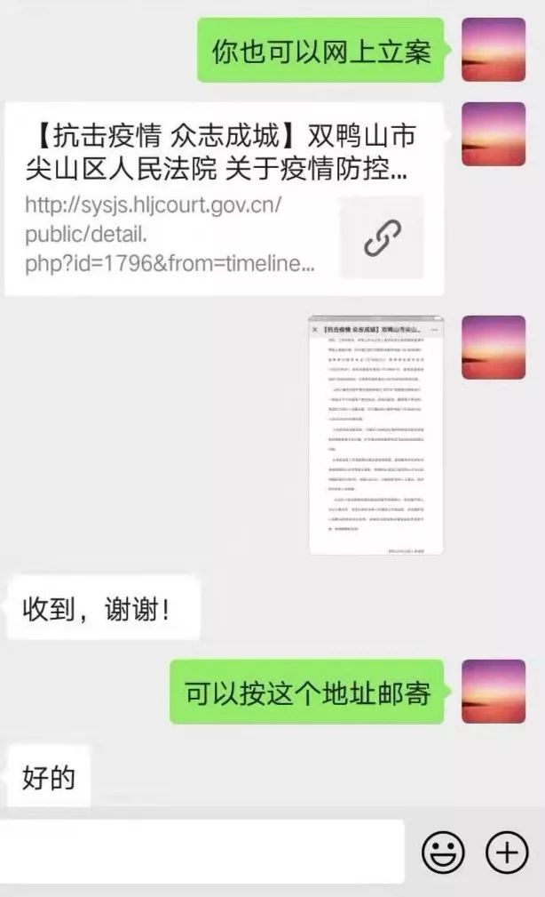 病毒无情法有情,双鸭山市两级法院在严峻的疫情面前迎难而上,坚守岗位,为我市疫情期间的法治环境保驾护航,2月3日至今,全市法院通过移动微法院、黑龙江法院诉讼服务网累计网上立案125件,邮寄立案1件; 12368诉讼服务热线及其他办公电话共接到当事人电话95个。双鸭山市两级法院的敬业精神受到了社会各界的点赞。