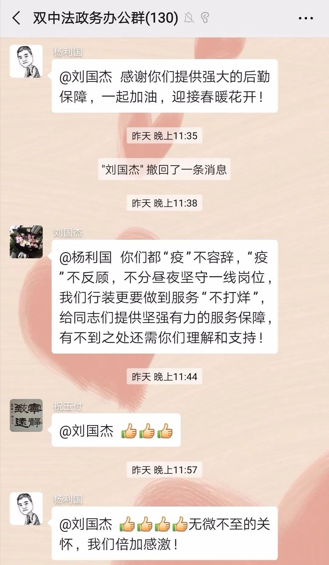 有一群人,他们默默无闻,虽未在卡口值守,但他们亦是“逆行者”;有一种力量,虽平凡但坚持,时刻温暖着干警的心;有一种担当,势不可挡,是全体干警的坚强后援。他们就是双鸭山中院司法行政装备管理科全体干警,团结协作、恪尽职守、任劳任怨、无私奉献,让战斗在一线防疫工作者们安心工作,全力做好新型冠状病毒疫情防控后勤保障,为打赢疫情防控阻击战提供全力支撑。