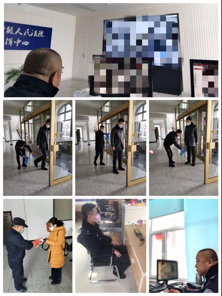 交通管制期间,院里总有几个忙碌的身影,有的坐在监控屏幕前观察着院内每一个监控点的风吹草动,一坐就是24小时;有的带着口罩在门口为每一位进入法院的干警测量体温、酒精消毒;他们默默地守护着法院和干警们的平安。