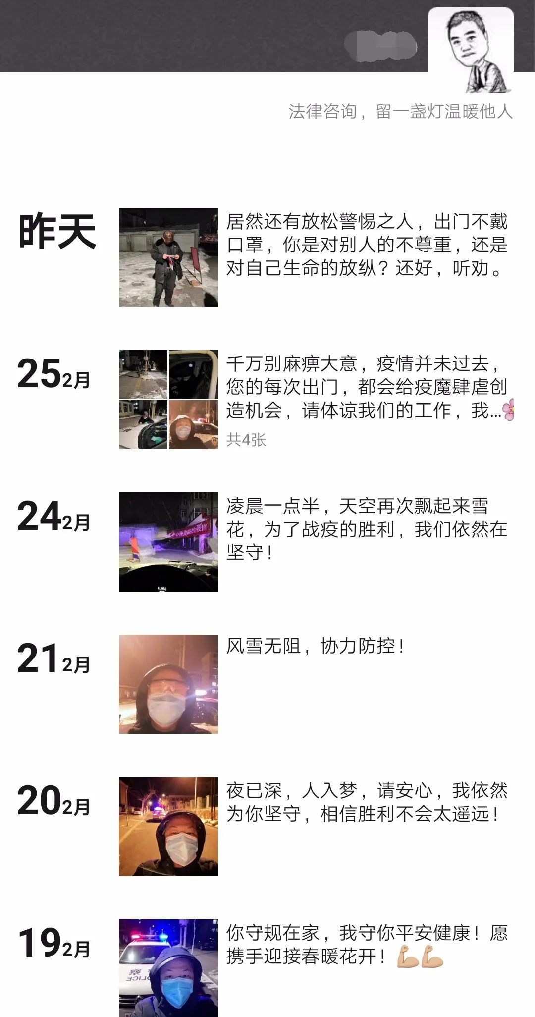 他们没有怨言,第一时间响应号召投身前线,他们是无数卡点防控人员的缩影,用行动诠释着初心和使命。2月18日以来,第六卡口全体干警在党组成员何惠录的带领下一直坚守抗“疫”前线,坚持“八必”工作要求,截至28日早7时,共登记人员442人次,登记车辆27辆,劝返人员28人。他们会继续以坚定的信心、坚毅的行动、做实做细的工作作风开展好卡口疫情防控和司法服务保障工作,展现双鸭山中院干警甘于奉献、勇于担当的精神风貌!