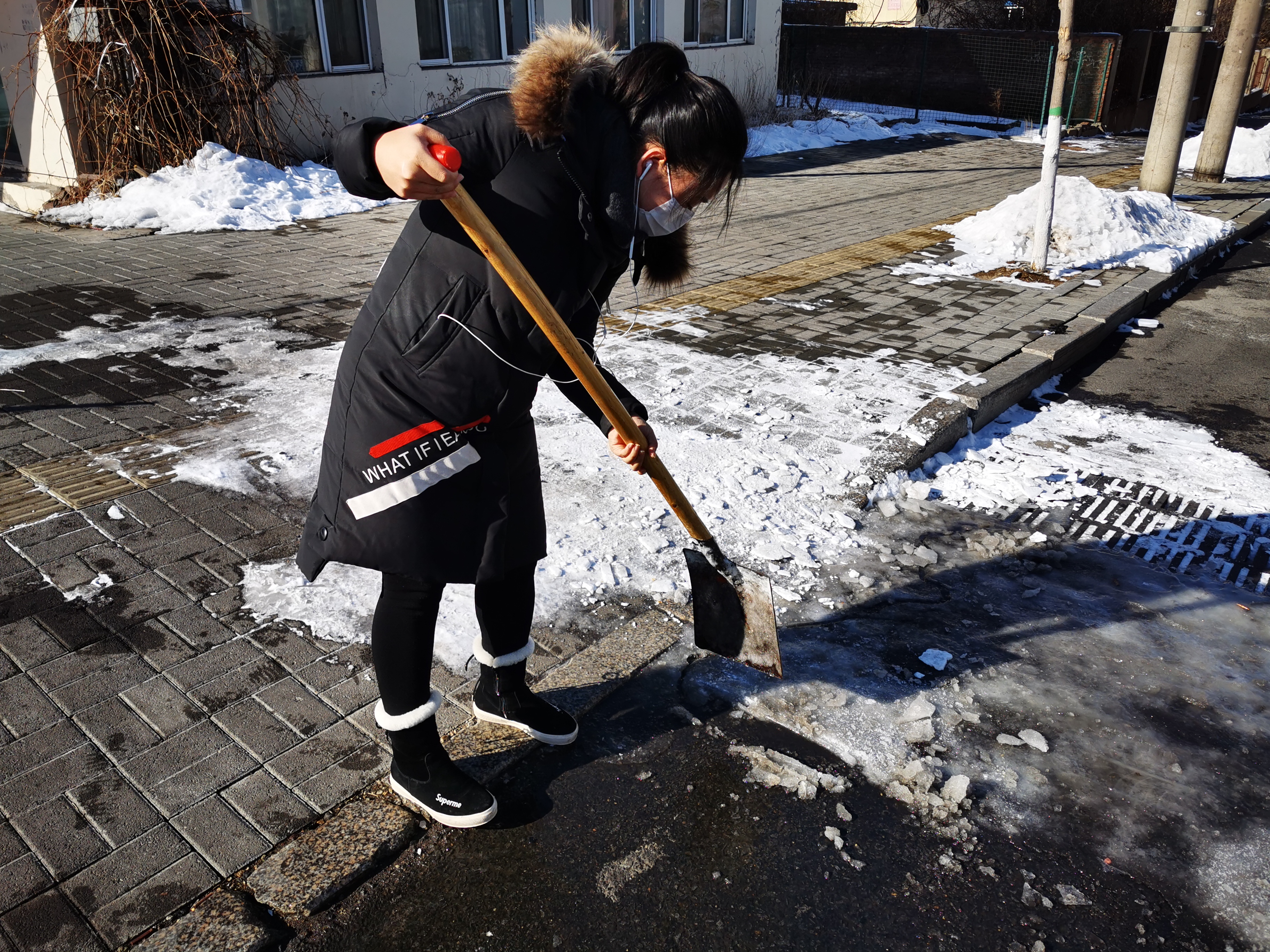 第六卡口有个“女汉子”田雪,前些日的大雪加上温度升高,导致小区门口结冰,因为怕小区老年人滑倒,她便借了锹开始清冰,从没干过这样的“重”活,锹也不听使唤无从下手,她转来转去、来回尝试了5、6分钟,终于掌握了这门“新技能”,用了半个多小时将冰雪清理干净,路过的居民看着她,边笑边夸她,她害羞的笑笑说:“能干点啥就干点啥”。