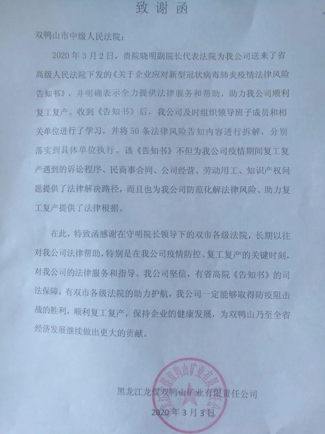 龙煤双矿集团发来《致谢函》,感谢两级法院长期以来特别是在疫情防控、复工复产的关键时刻提供的法律服务和指导,感谢省法院制发的《告知书》,为双矿集团防范化解法律风险、助力复工复产提供了法律依据。