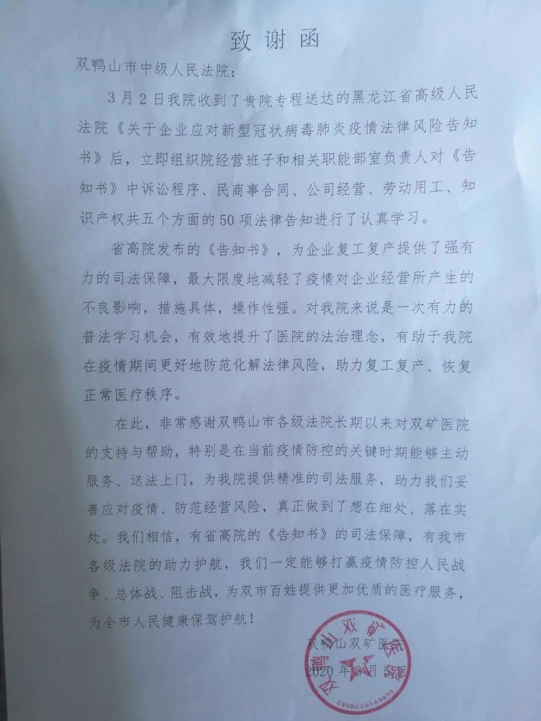 双矿医院发来《致谢函》,表示省高院发布的《告知书》,为企业复工复产提供了强有力的司法保障,最大限度地减轻了疫情对企业经营所产生的不良影响,措施具体、操作性强。感谢双鸭山市两级法院长期以来对双矿医院的支持与帮助,特别是在当前疫情防控的关键时期能够主动服务、送法上门,提供了精准的司法服务,助力妥善应对疫情、防范经营风险,真正做到了想在细处、落在实处。