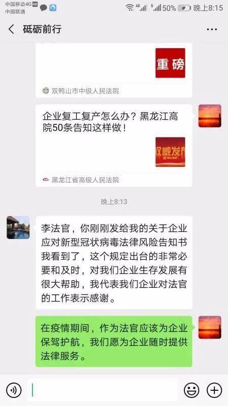 两级法院从组织发动、点对点告知、媒体宣传三个方面切入,以中院党组成员、基层法院院长和民商事审判条线3个层面推进,向322名各级代表委员和100余家企业推送了《法律风险告知书》,广泛宣传复工复产中可能面临的法律问题,告知应对纠纷解决的处理方法,主动征求对两级法院服务保障工作的意见建议,助力企业复工复产、正常经营。得到各级代表委员、龙煤双矿、建龙钢铁、宏展集团、万里润达、深粮集团、黑龙双锅、双矿医院、新时代水泥等90余家中省直企业、百大项目和辖区重点企业肯定。