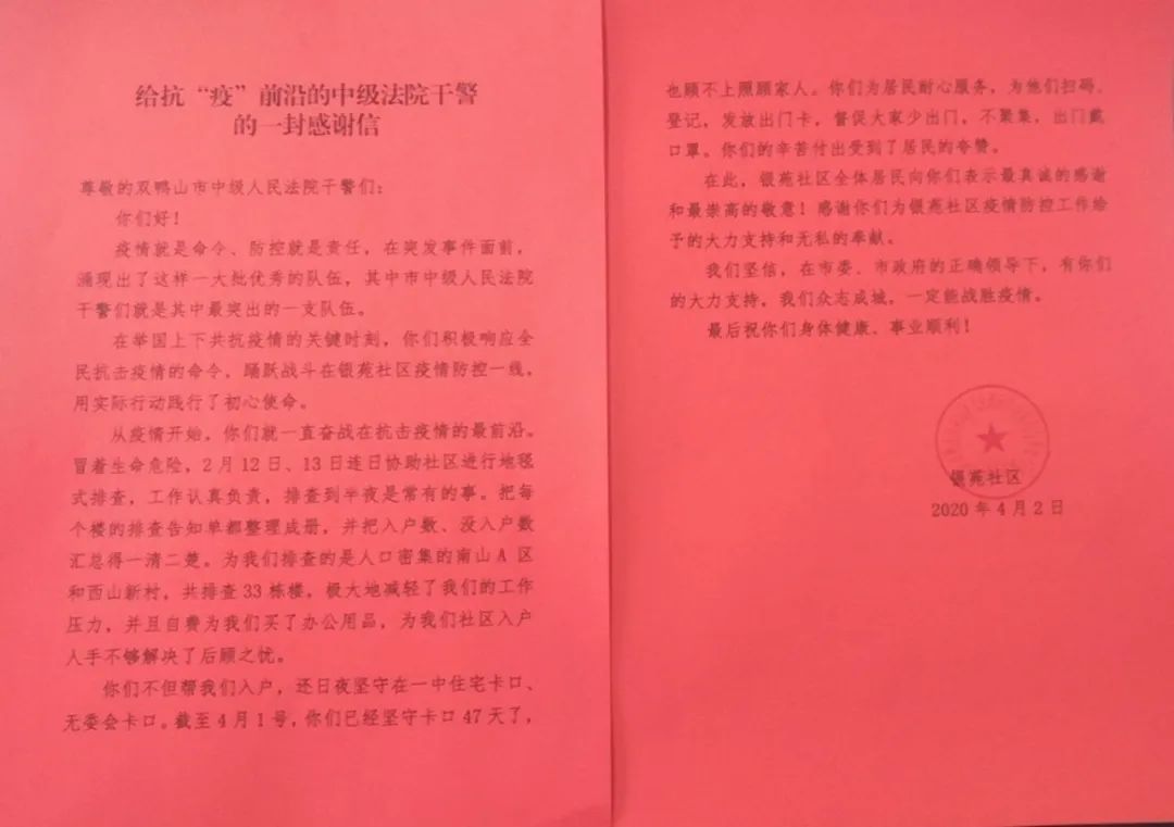 从疫情开始,你们就一直奋战在抗击疫情的最前沿。冒着生命危险,2月12日、13日连日协助社区进行地毯式排查,工作认真负责,排查到半夜是常有的事。把每个楼的排查告知单都整理成册,并把入户数、没入户数汇总得一清二楚。为我们排查的是人口密集的南山A 区和西山新村,共排查33栋楼,极大地减轻了我们的工作压力,并且自费为我们买了办公用品,为我们社区入户人手不够解决了后顾之忧。