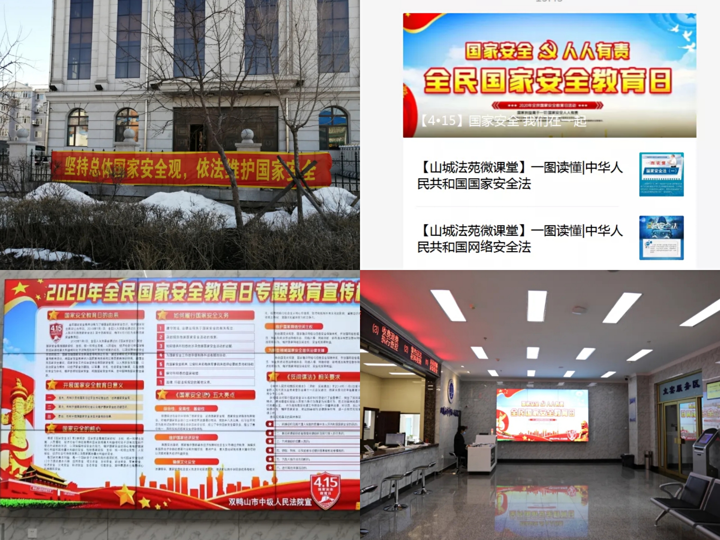双鸭山中院通过在院机关门口、立案大厅LED电子屏及办公区一楼大厅设置宣传版、条幅,宣传《中华人民共和国国家安全法》《中华人民共和国反间谍法》《中华人民共和国反恐怖主义法》和防范邪教等法律法规,在传统宣传方式的基础上,还充分运用“一网双微”等新媒体平台,提高国家安全法治宣传的影响力和传播力;双鸭山中院70余名干警参加“龙江网络学院”总体国家安全观和国家安全法专题学习和答题活动,让维护国家安全人人有责的观念深入人心。
