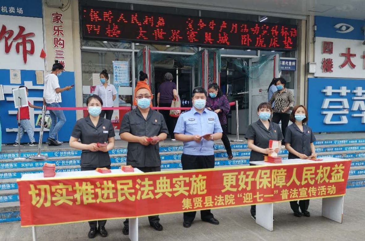 集贤县法院党员干警在家乐购超市门前设立宣传台,通过发放宣传册、提供法律咨询等形式向过往群众宣传《民法典》,共发放宣传资料1000余份,现场解答群众咨询20余人次。