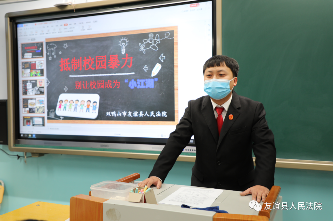 活动中,法官助理赵柏旭围绕“校园暴力”为主题进行讲解,着重介绍了“什么是校园暴力,都有哪些表现形式,校园暴力对被施暴者带来哪些危害”等内容,运用具体实例,以案释法、以法论事。授课过程设立了问答环节,赵柏旭针对青少年普遍关心的一些法律热点问题进行解答,教导学生提高自我防范能力,运用法律手段维护自身合法权益,预防校园欺凌,远离校园犯罪。同学们认真聆听,并积极参与互动,取得了良好的法治宣传效果。