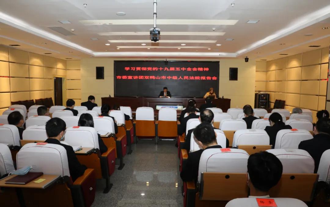 为深入学习贯彻党的十九届五中全会精神,12月4日,双鸭山中院举行学习贯彻党的十九届五中全会精神宣讲报告会,邀请市委学习贯彻党的十九届五中全会精神宣讲团成员、市委党校教授张玉秀为全院干警做专题宣讲,各基层法院在分会场以视频形式参加,两级法院党组成员及干警477人参加学习。