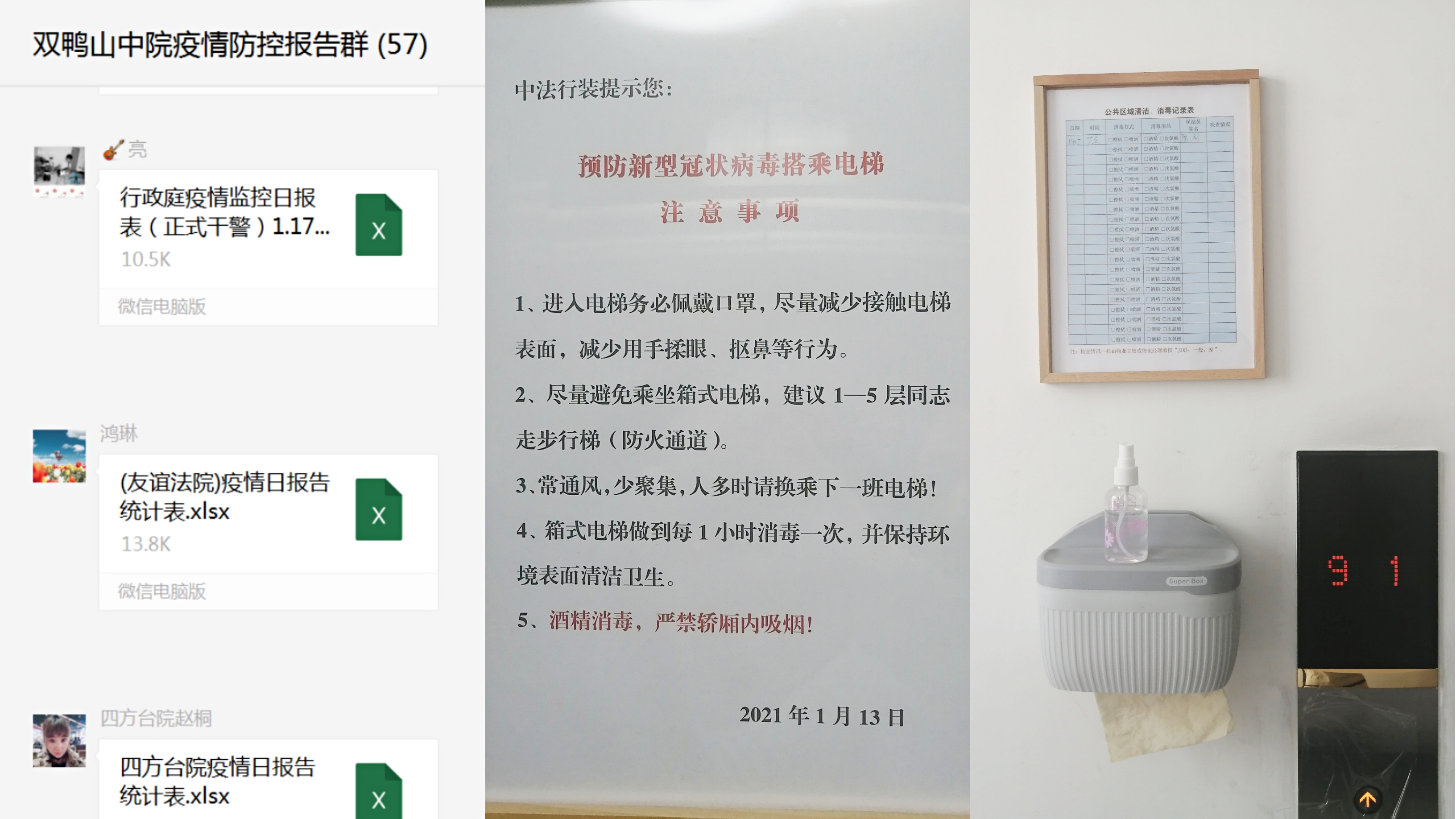 落实防控要求。积极按照上级要求落实防控任务,充分发挥党组织战斗堡垒作用和广大党员先锋模范作用,党组成员、各部门负责人、全体党员要冲在前、走在前,敢于担当、勇于作为,始终做到守土有责、守土担责、守土尽责;加强法院内部防控管理,认真开展排查工作,两级法院干警填写《全市法院干警“新冠肺炎”疫情筛查“日报统计表”》,并指定专人每日上报;严格落实进出登记制度,对法院干警进行每日体温检测,沿用疫情防控“三件宝”,增设查验行程卡流程;严格按照标准和次数开展防疫消杀工作,对安检室、审判法庭、电梯、楼梯间、卫生间、楼梯走廊、诉讼服务大厅等人流密集区域,按照防疫规定坚持每日消毒清洁,时刻保持工作场所环境安全,定时通风换气,在公共区域佩戴口罩,保证公共区域卫生安全。