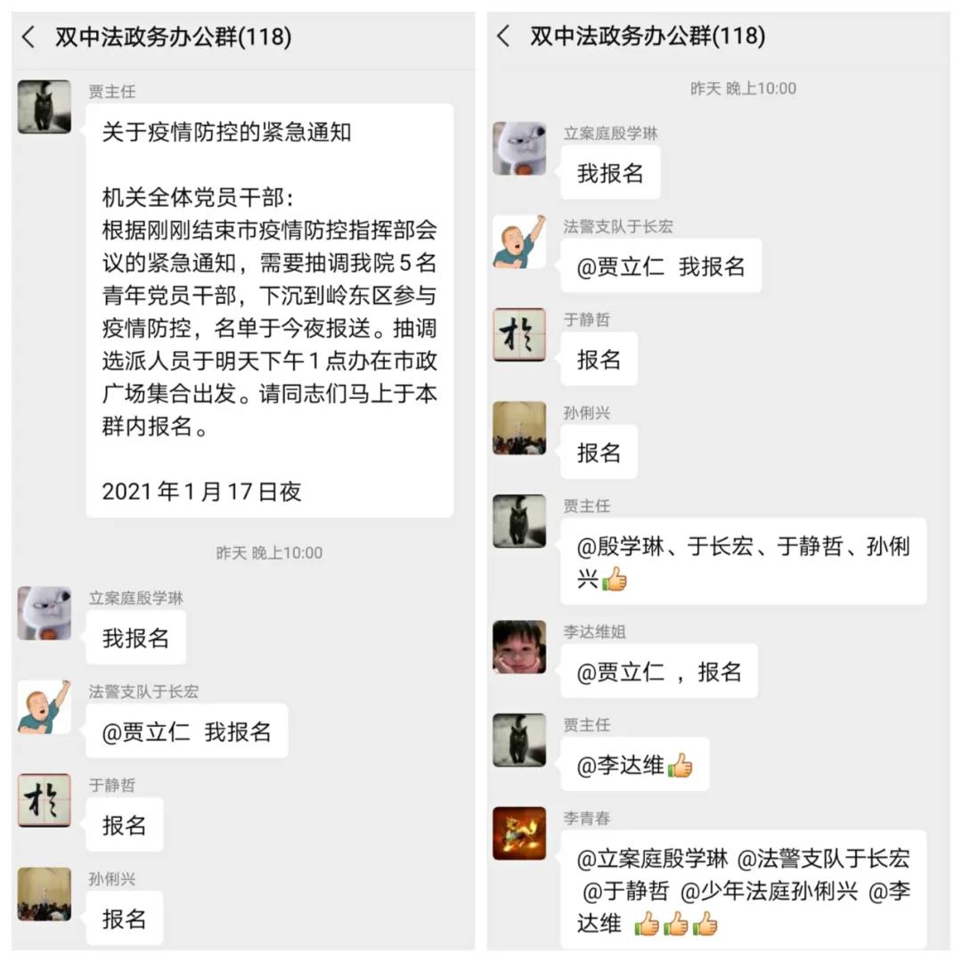 1月17日深夜,接到市疫情防控指挥部紧急通知后,双鸭山中院党组高度重视,把疫情防控作为当前最重要、最紧迫的政治任务,积极落实,迅速行动,当夜就组织动员干警报名参加疫情防控,14个小时内,47名干警踊跃报名。1月18日,组织宋正、于长宏、陈阵、张宝佳、李达维5名党员志愿者下沉到岭东区博爱园中山社区,助力防疫工作,用实际行动彰显“法院人”的奉献与担当。
