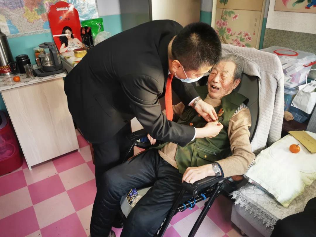 贾立仁为老干部带上法徽,希望在新的一年里,能够继续关注和支持法院工作,以自己的阅历和专长,积极为法院发展献言献策,共同推进法院各项工作不断进步。