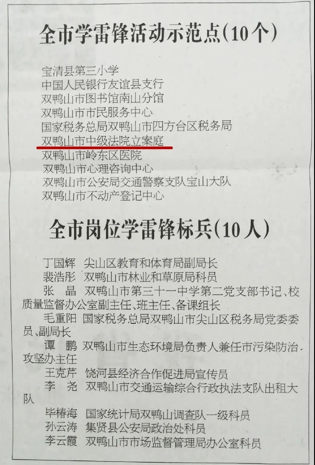3月5日,双鸭山市中级人民法院立案庭被中共双鸭山市委宣传部命名为全市学雷锋活动示范点。双鸭山中院立案庭将珍惜荣誉、再接再厉,坚持立足岗位学雷锋,走上社会学雷锋,始终做雷锋精神的忠实传承者和社会主义核心价值观的模范践行者。