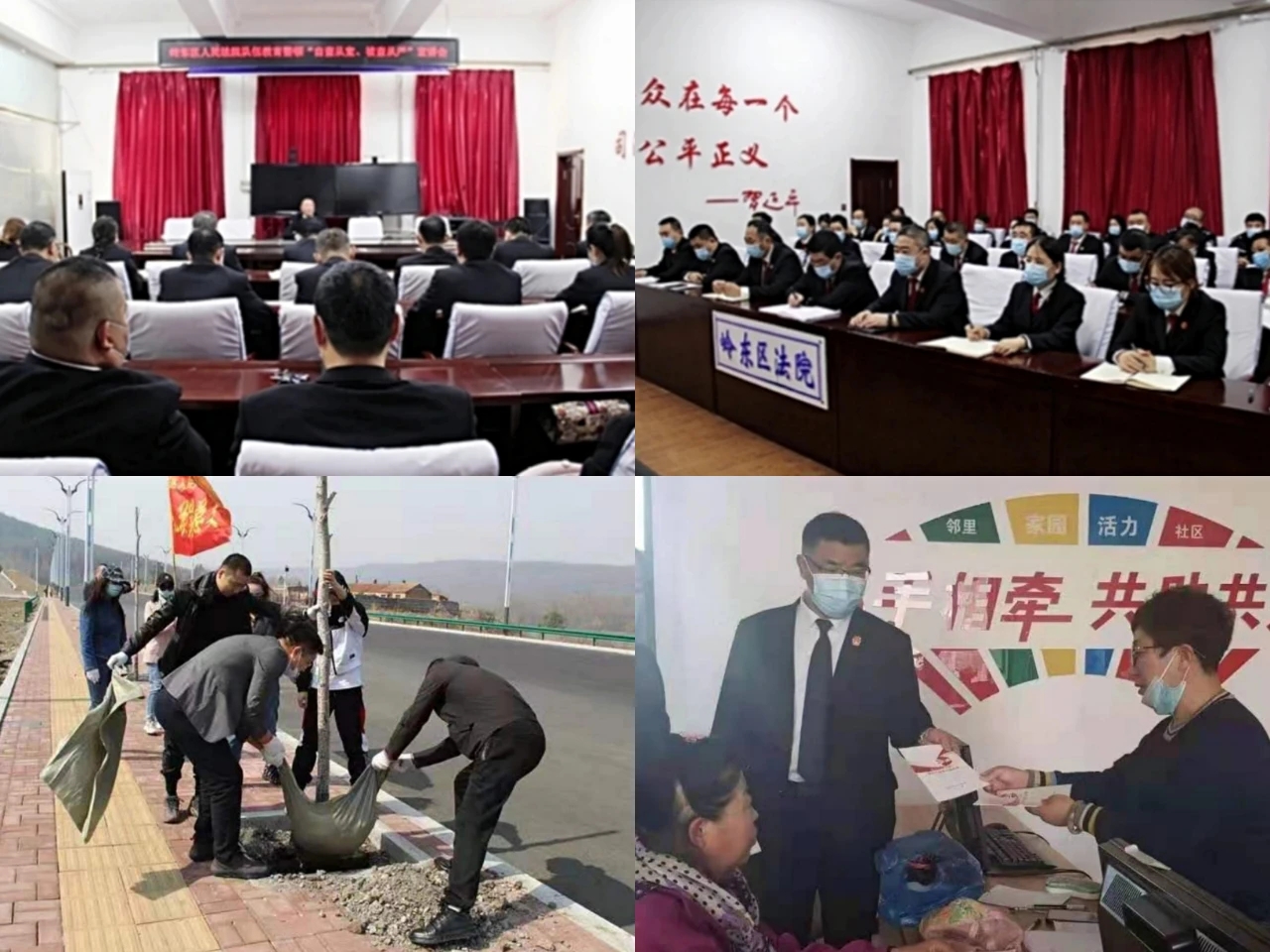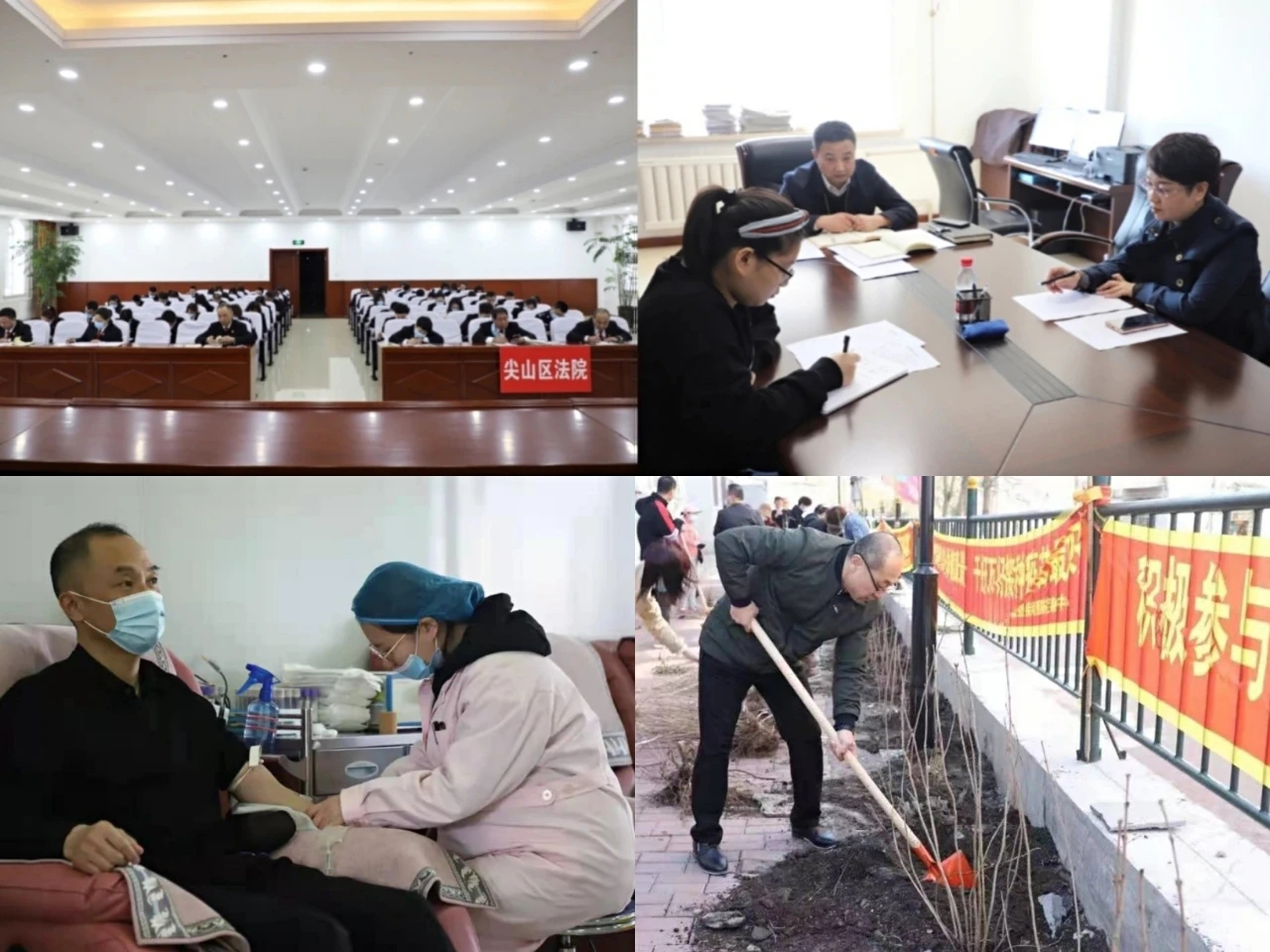 尖山区法院注重思想发动,召开队伍教育整顿“自查从宽、被查从严”宣讲会,广泛开展谈心谈话,坚持开门纳谏,深化为民服务措施,党组成员发挥表率作用,全院各部门齐行动,走访辖区企业10余家,梳理出意见建议14条,为辖区企业解决实际问题9个;积极开展知识产权法治宣讲、无偿献血和植树等义务活动,扎实推进“我为群众办实事”实践活动取得实效。
