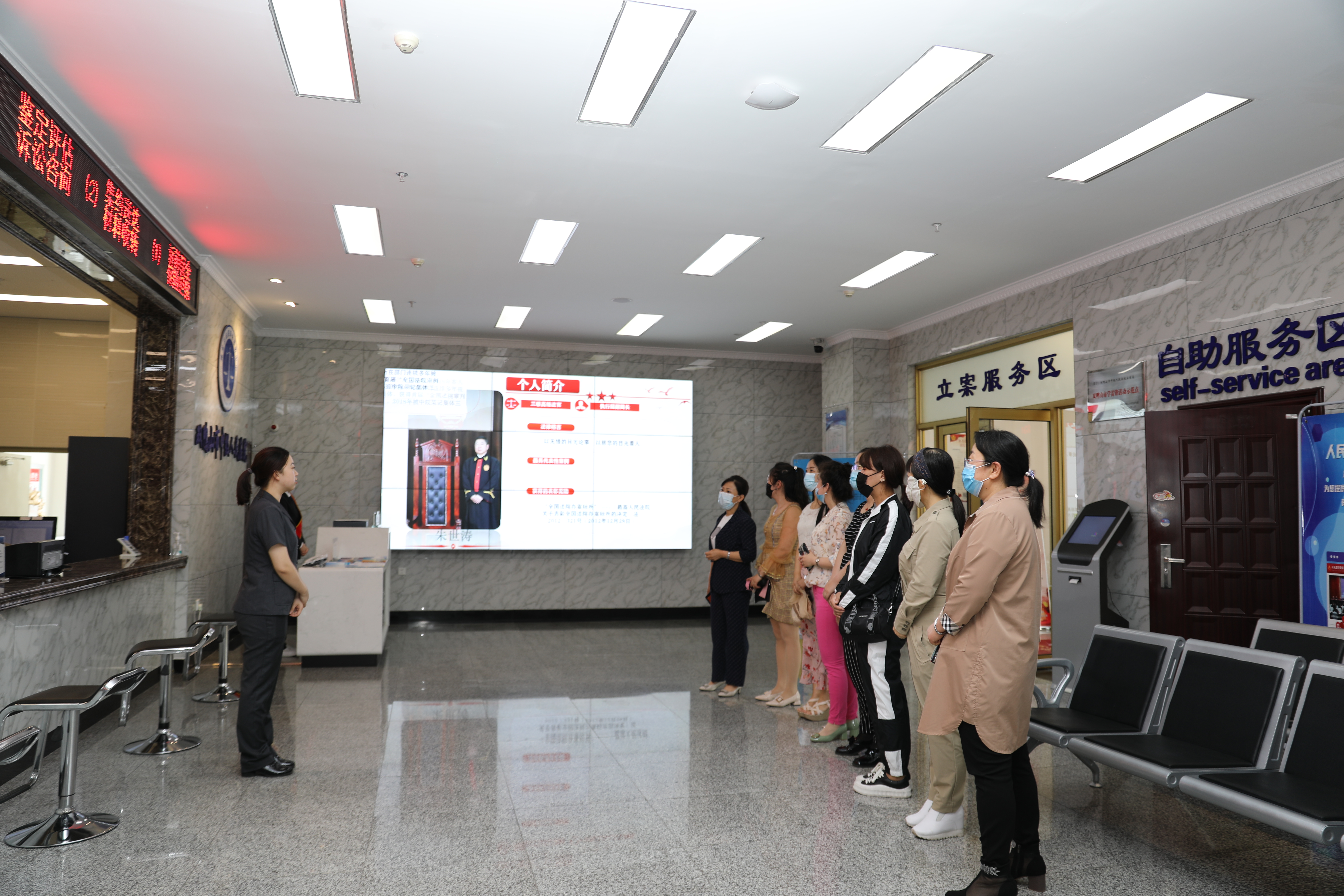教师们参观了诉讼服务中心、科技法庭、执行指挥中心和图书馆等场所,在工作人员的介绍下,了解法院司法便民举措和设施,以及为满足人民群众多元化司法需求推行的网上开庭调解、视频接待、电子送达等线上服务。