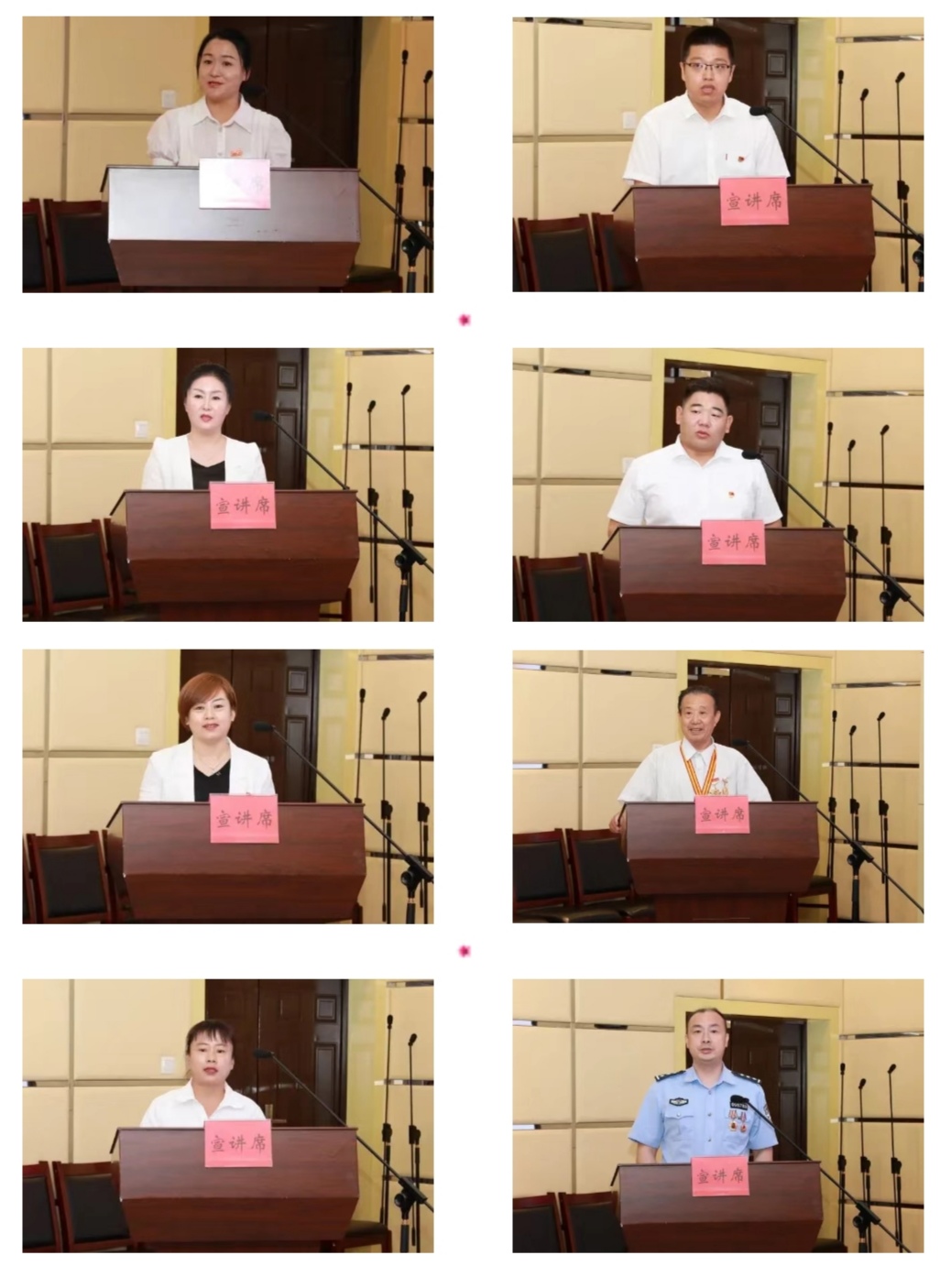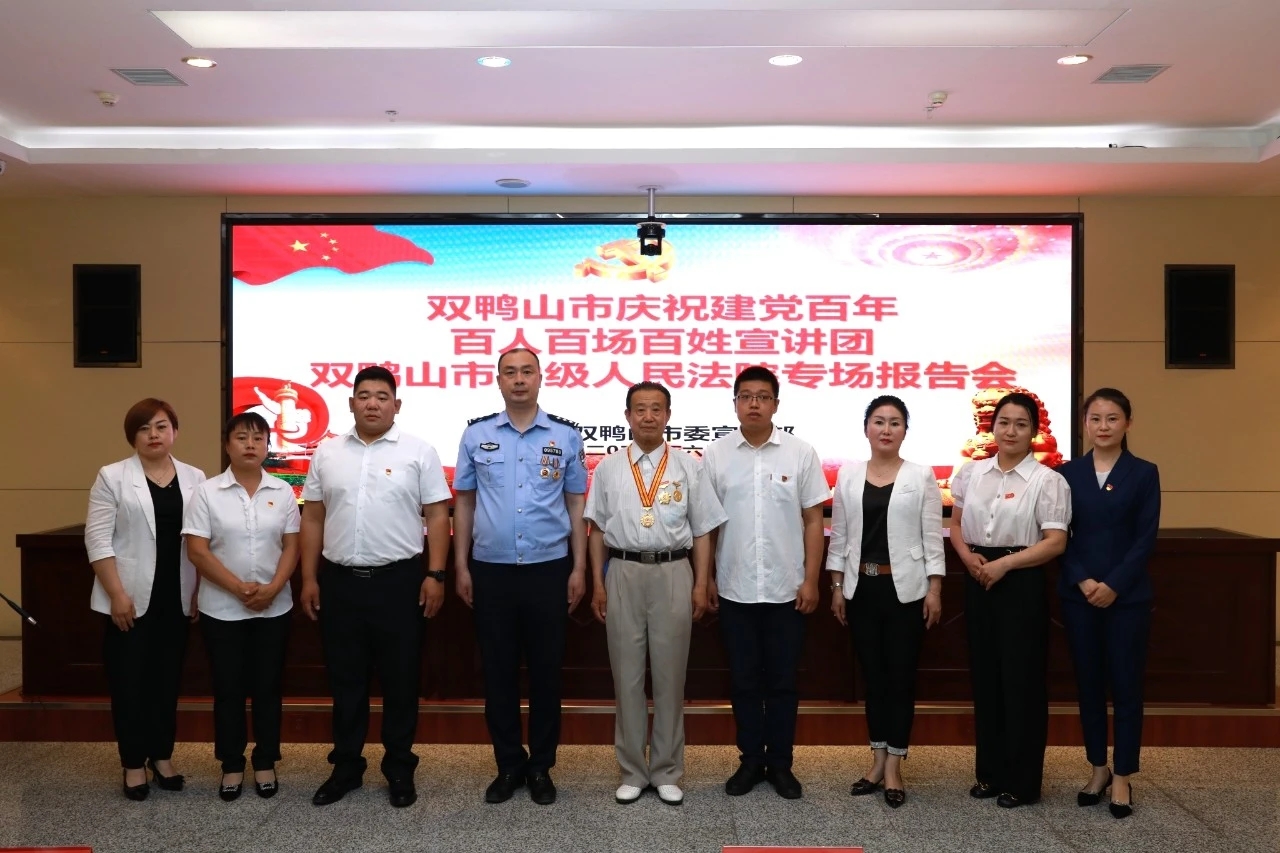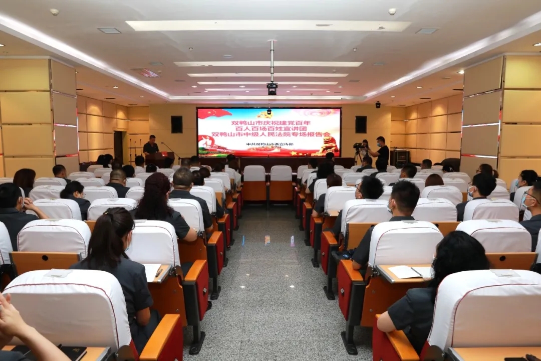 为充分展示中国共产党百年光辉历程、伟大成就和宝贵经验,营造共庆建党百年华诞的浓厚氛围,6月23日,庆祝建党百年“百人百场百姓宣讲” 专场报告会在双鸭山中院举行,宣讲团8名成员为全院干警作报告。