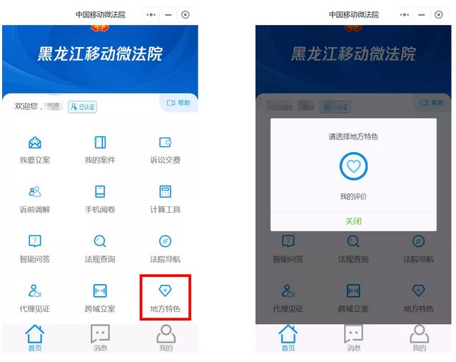 进入微信小程序“黑龙江移动微法院” ,点击首页“地方特色”模块,选择“我的评价”,跳转至评价列表页面。