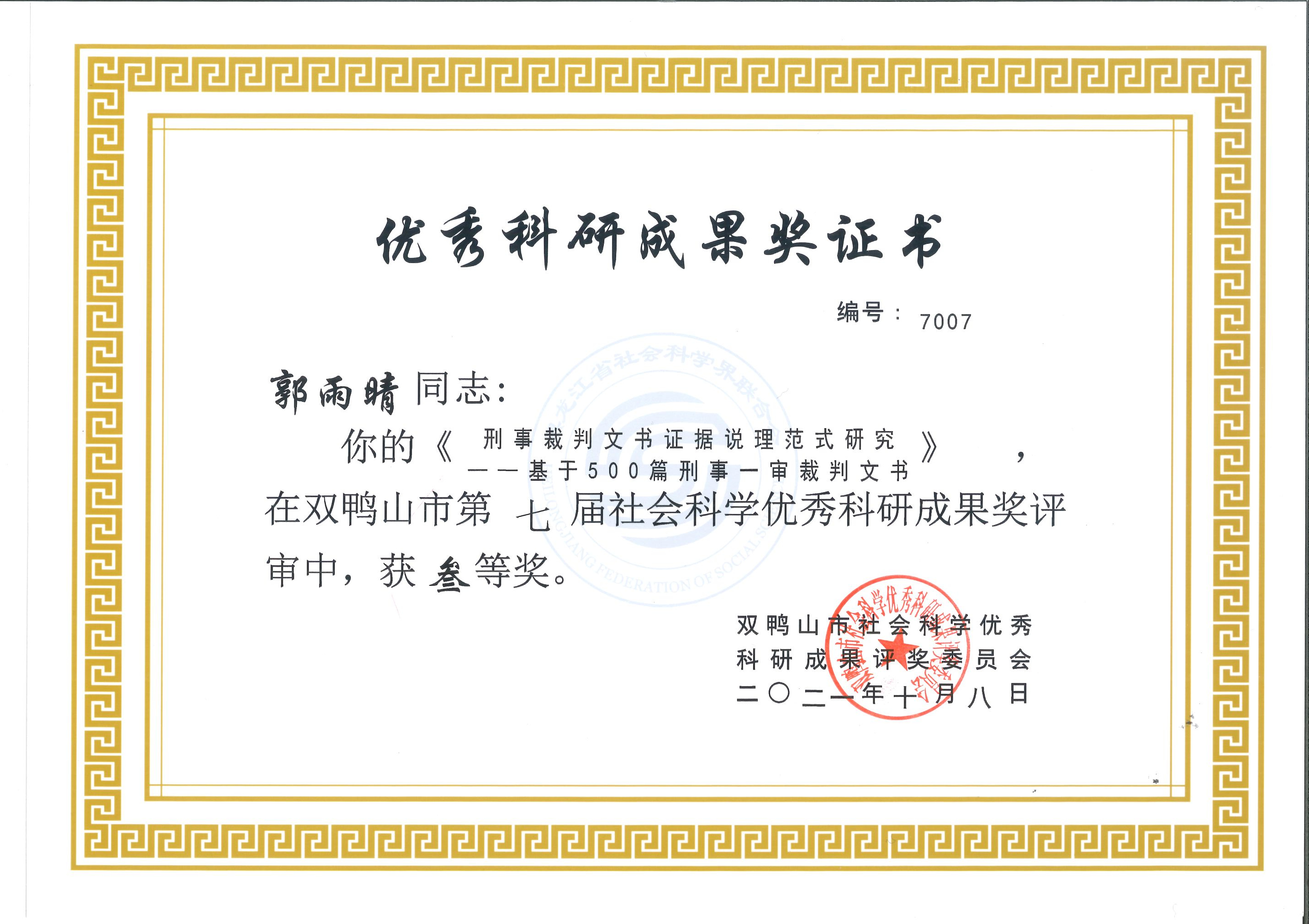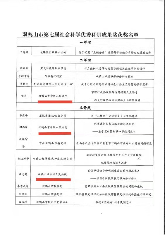 为调动全市广大社会科学工作者研究、探索社会科学基础理论、应用理论的积极性和创造性,更好的服务经济社会发展,双鸭山市社会科学优秀科研成果评奖委员会开展第七届社会科学优秀科研成果评奖工作,共评出13项优秀成果,双鸭山中院3项法学研究成果荣获市第七届社会科学优秀科研成果奖。