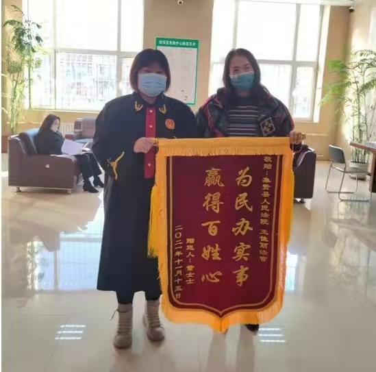 王佳丽法官从接到案件起便第一时间联系了本案双方当事人,了解了上述案件事实,查阅以往案件,并征求了双方当事人的意见。仅用了1天就解决了董某某的烦忧,使董某某顺利缴纳热费。为感激办案法官耐心办案为民解忧,特地赠予法官一面锦旗。
