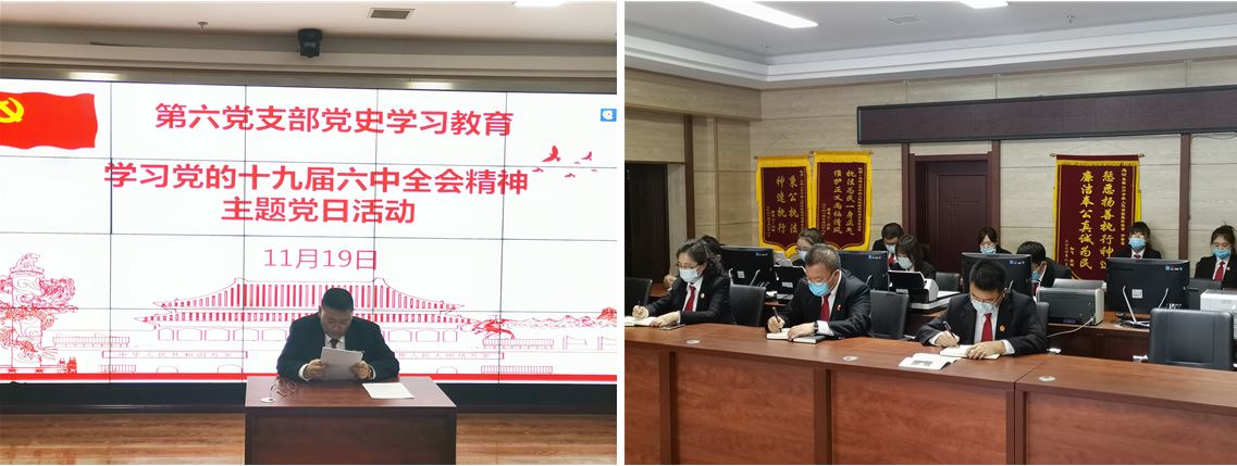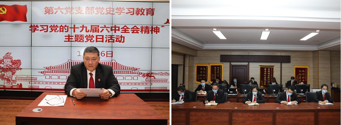 第六党支部连续两个周五召开集中政治学习,分别学习了《中国共产党第十九届中央委员会第六次全体会议公报》和中央政法委秘书长陈一新在学习时报的署名文章《深刻把握六中全会精神的核心要义和实践要求》,市中院党组成员、副院长于夫鑫作为普通党员参加政治学习。为创新学习方法,第六党支部组织干警通过极光新闻APP-全会精神随身听模块开展自学,努力做到从党的百年奋斗重大成就和历史经验中感悟初心、增强自信、汲取力量,确保学用结合、学以致用,听党话、感党恩、跟党走。