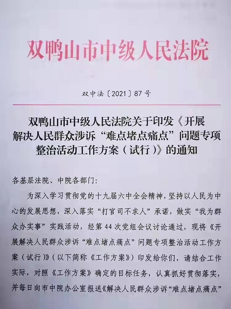 12月6日,双鸭山市中级人民法院制定关于开展解决人民群众涉诉“难点堵点痛点”问题专项整治活动工作方案(试行),确定专项活动的指导思想、主要任务、时间安排和工作要求,扎实推进,落细落实。