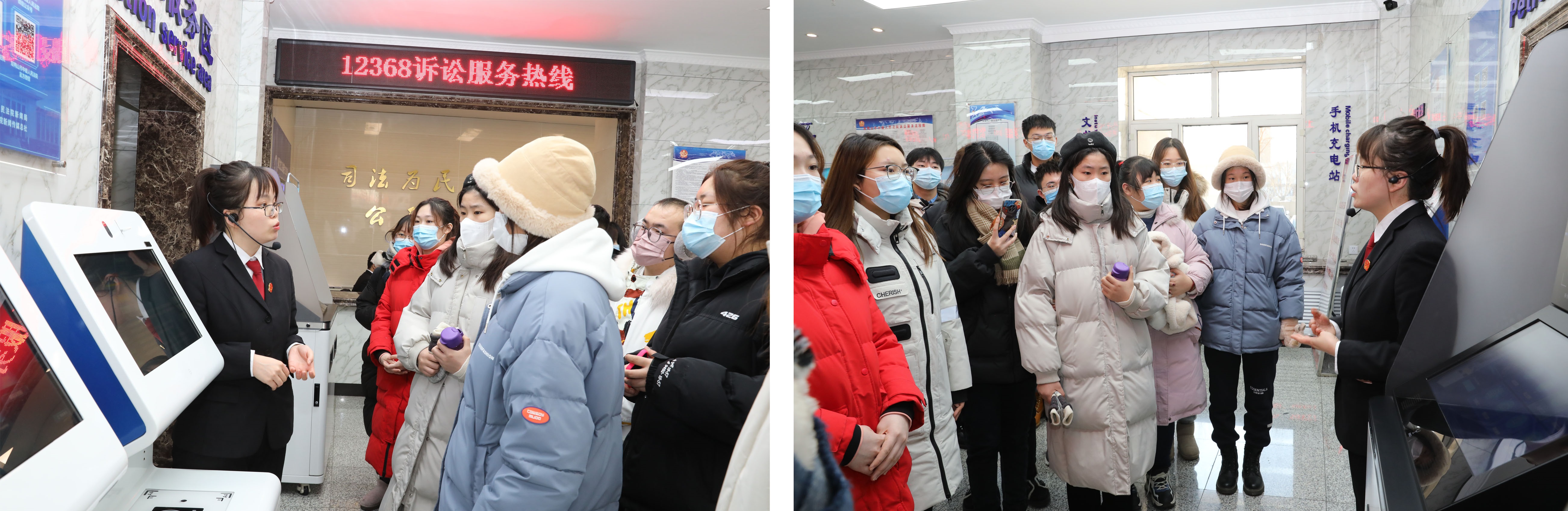 同学们首先参观了诉讼服务中心,讲解员介绍了多种现代化诉讼服务机器的功能,很多同学兴致勃勃的尝试了风险评估机和诉状辅助生成机的功能作用,对智能云柜更是赞赏不已,同学们不禁赞叹法院服务的便民高效,通过热线就可以完成法律咨询、案件查询等服务,而且会有法官在24小时内解决问题,他们说“法院和我想的一点都不一样啊!”