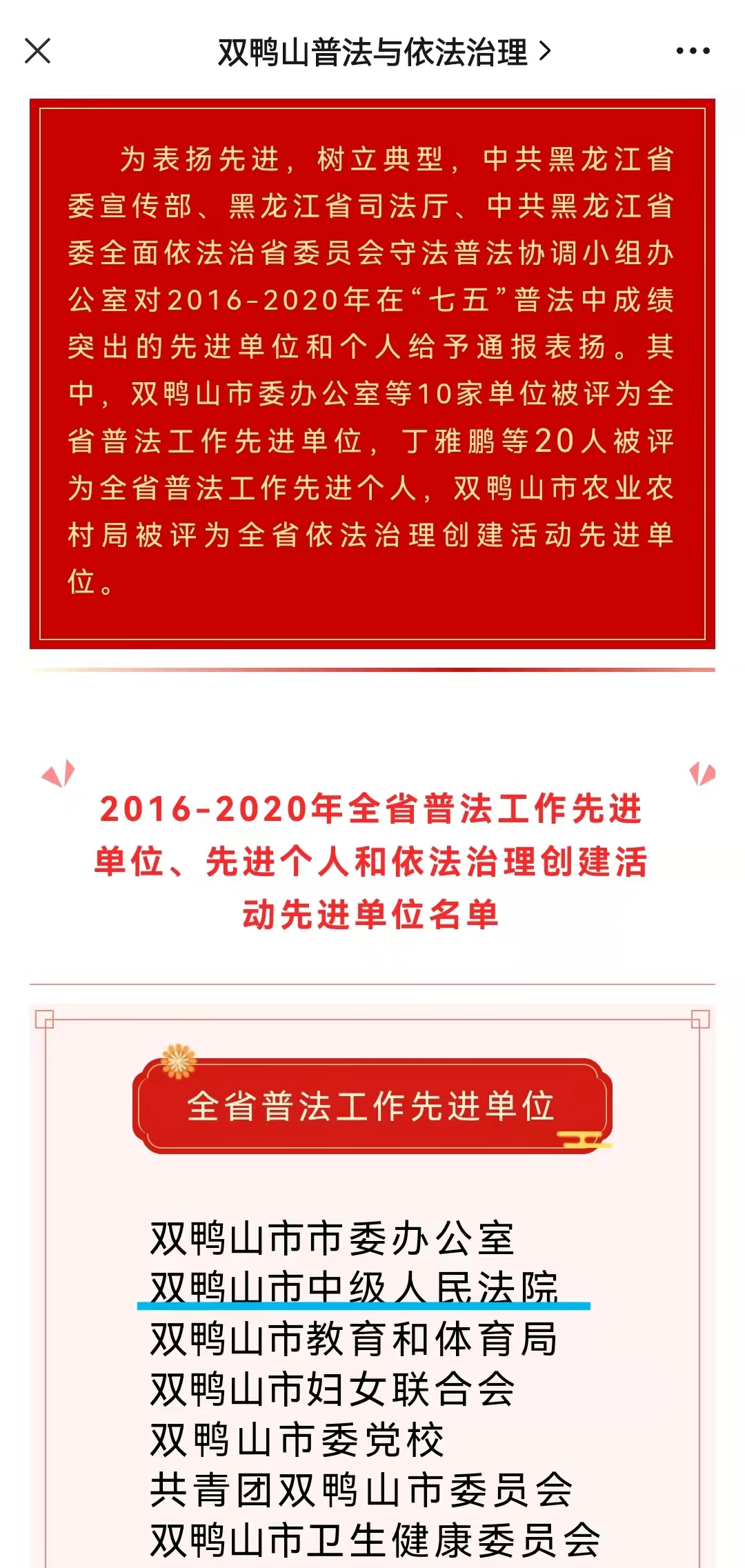 近日,中共黑龙江省委宣传部、黑龙江省司法厅、中共黑龙江省委全面依法治省委员会守法普法协调小组办公室对2016-2020年在“七五”普法中成绩突出的先进单位和个人给予通报表扬,双鸭山市中级人民法院荣获全省“七五”普法工作先进单位。