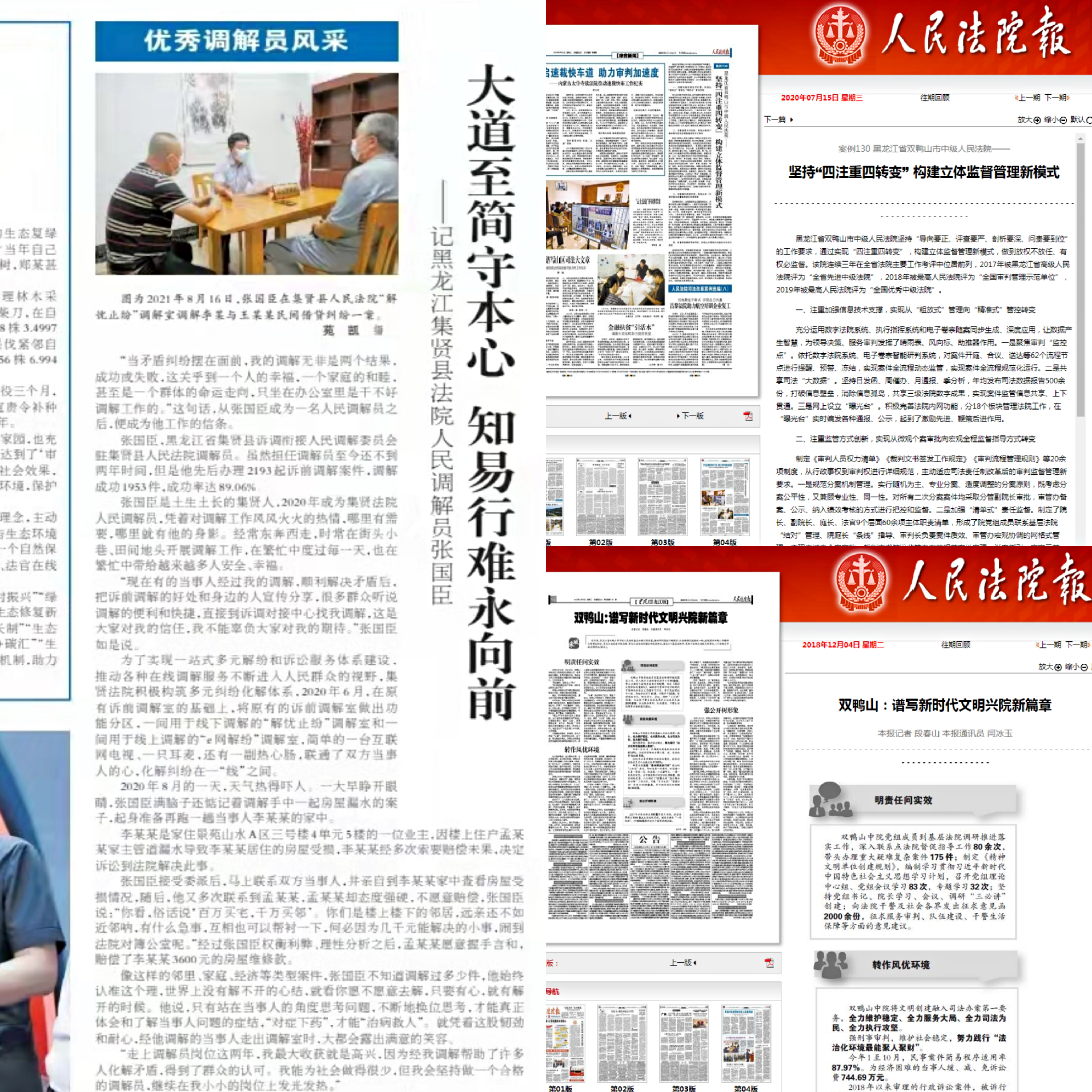运用互联网思维及技术和全方位、多角度的司法公开渠道,锻造革新自有的“一网双微”平台,结合审判执行工作实际,以百姓关注的视角,主动发声,普及法律常识,公开司法行政信息,发布各类稿件20000余篇,官方网站累计被访问量超1.3亿次。在完善自媒体平台的基础上,开设官方“头条号”“澎湃问政”“抖音”等新媒体客户端,粉丝数量总计超十万。《人民法院报》以“谱写新时代文明兴院新篇章”为题刊载创建省级文明单位情况,2篇审判实务独创文章被中文核心期刊《法律适用》刊发,1篇智慧法院建设论文被《法治日报》刊载,集贤法院调解员张国臣调解纠纷2476件,工作做法被《人民法院报》刊载。