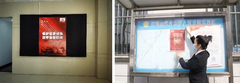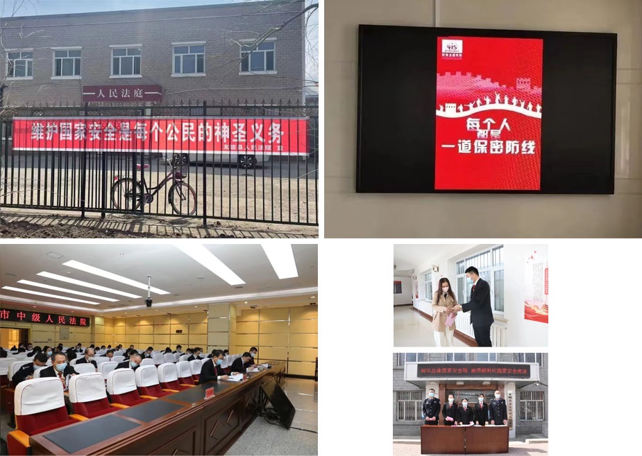 两级法院通过悬挂条幅、标语,制作宣传板、LED电子屏等方式,积极宣传《中华人民共和国国家安全法》《中华人民共和国反间谍法》《中华人民共和国反恐怖主义法》和防范邪教等法律法规,在传统宣传方式的基础上,还充分运用“一网双微”等新媒体平台,开辟“国家安全日宣传周”等专栏,提高国家安全法治宣传的影响力和传播力;双鸭山中院70余名干警参加全省国家安全知识网上答题活动,两级法院开展知识测试,让维护国家安全人人有责的观念深入人心。