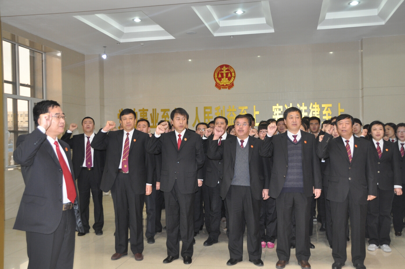 12月4日15时正,双鸭山市中级法院全体法官,在常务副院长李晓明同志的带领下,面向国旗庄严宣誓:忠于祖国,忠于人民,忠于宪法和法律,忠实履行法官职责,恪守法官职业道德,遵守法官行为规范,公正司法,廉洁司法,为民司法,为维护社会公平正义而奋斗!