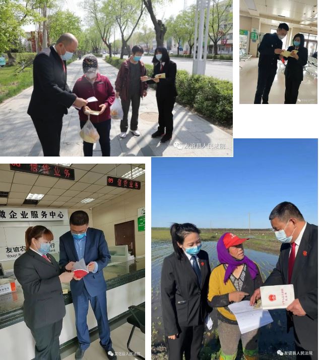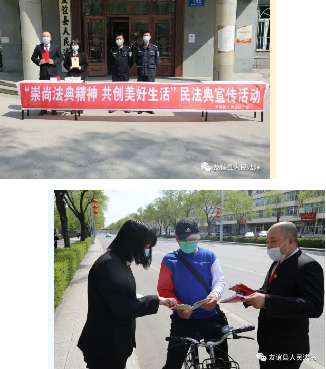 友谊县法院干警以此活动为契机,一是来到农村、社区百姓身边为百姓讲解了民法典的基本原则及与生活息息相关的胎儿继承、网络侵权、高空抛物、遗嘱效力、夫妻共同债务认定等法律知识,并对重点法条进行了详细的讲解, 运用通俗易懂的语言诠释了法律内涵,让《民法典》走进百姓身边,走进群众心里;二是进入企业、机关单位进行大力宣传民法典,通过把法条与实际案例相结合,进一步提高了对《民法典》的认识,引导自觉学习《民法典》;三是组织友谊县法院干警开展法律咨询和普法宣传活动,在法院门前设立咨询台,悬挂条幅,并走向街头向群众进行普法宣传,向群众现场发放了《民法典》《民法典应知应会200条》等法律法规宣传书籍宣传册100余份,接待法律咨询30余人次,积极引导群众学习《民法典》的知识,解答群众咨询的关于土地、家庭婚姻等问题,调动了广大群众的学习法律热情,让“法”深入人心。